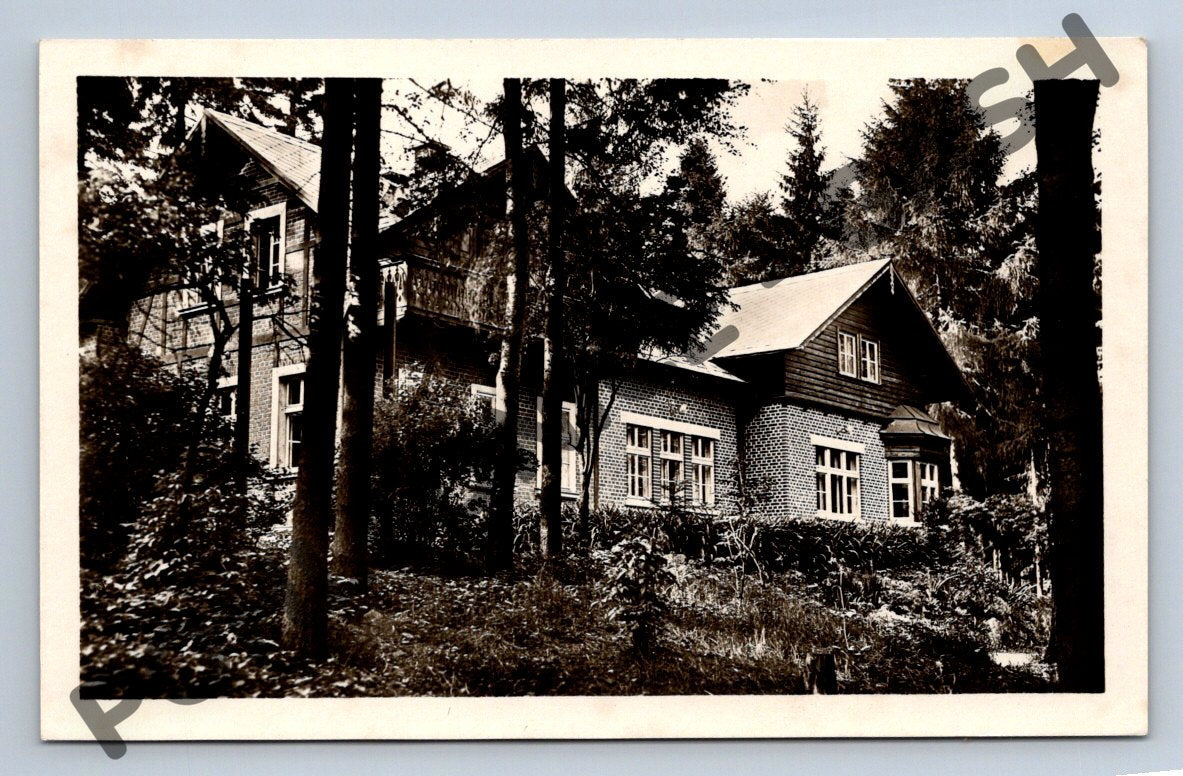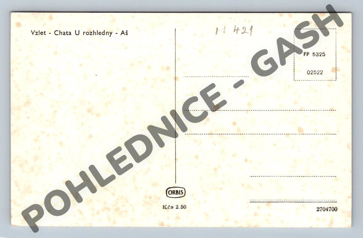 Tato stará černobílá pohlednice zobrazuje chatu U rozhledny v Aši, známé rekreační místo ubývající v zasazeném přírodním prostředí lesů. Pohlednice pochází z období před rokem 1950 a je vydána nakladatelstvím Orbis, přičemž označení KČs 2.50 naznačuje tehdejší cenu. Na zadní straně je název místa Vzlet - Chata U rozhledny - Aš a prostor pro adresu a známku, typický pro pohlednice této doby. Pohlednice je v dobrém stavu s mírným žloutnutím papíru, které odpovídá stáří. Ideální sběratelský kousek pro milovníky české historie a přírody, zejména zájemce o pohlednice s tématem českých chatek a rekreačních objektů v pohraničních oblastech.