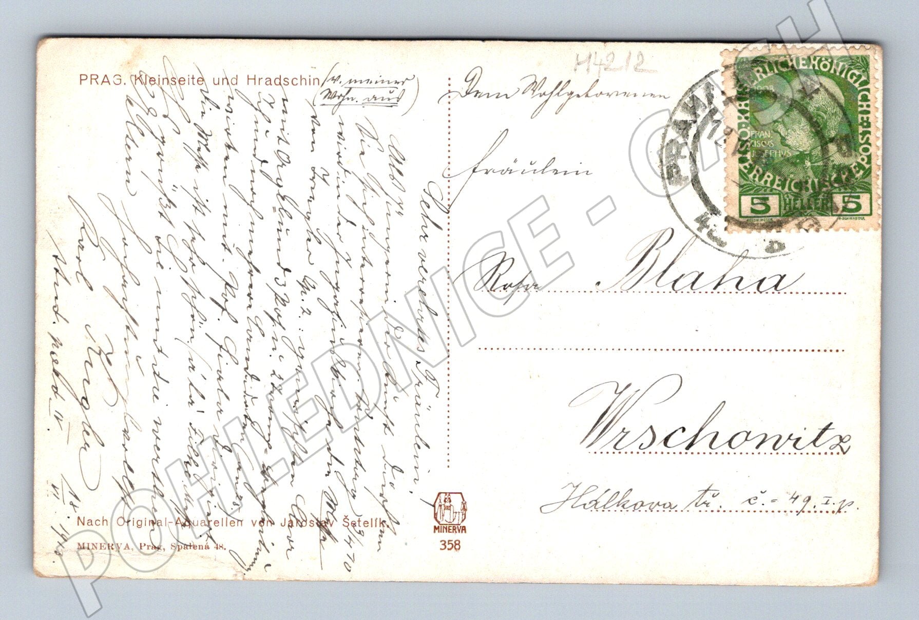 Starobylá pohlednice s akvarelovým motivem Prahy, konkrétně pohled na Malou Stranu a panorama Hradčan. Pohlednice je kolorovaná podle originálu od Jana Š. Stellíka a vydána nakladatelstvím Minerva, Praha, Spálená 14. Na zadní straně je čitelně viditelný rukopisný text, adresa a dobová známka s razítkem z Prahy. Formát odpovídá malému formátu typickému pro období před rokem 1950. Skvělý sběratelský kousek zachycující atmosféru historické Prahy.