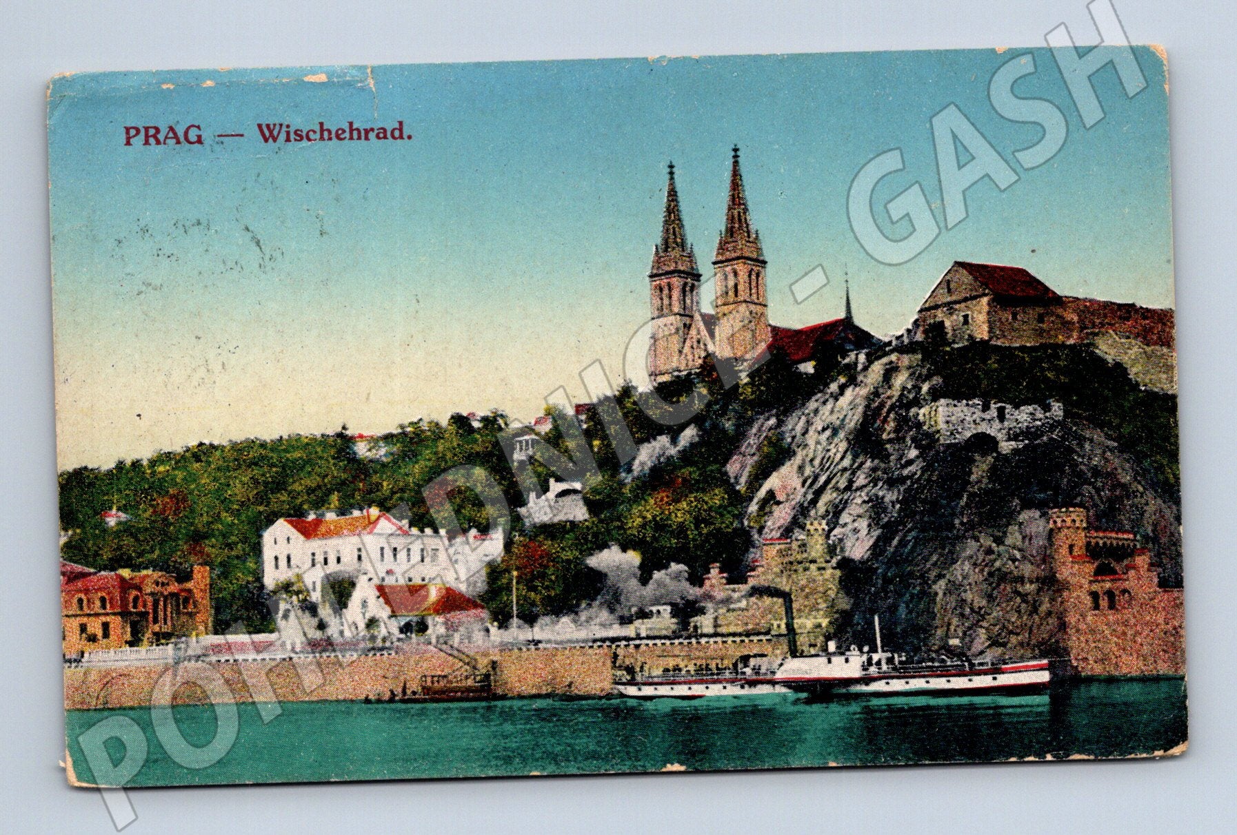 Starobylá pohlednice zachycující ikonický pohled na pražský Vyšehrad s dvojicí věží Baziliky sv. Petra a Pavla a malebným nábřežím Vltavy. Pohlednice je kolorovaná, zachycuje detaily architektury i parník na řece. Na zadní straně je původní ručně psaný text a adresa, což dokládá historický charakter zásilky. Stáří odhaduji první polovina 20. století (do roku 1950). Pohlednice je v dobrém sběratelském stavu, mírné opotřebení rohů odpovídá stáří. Vhodné pro sběratele historických pohlednic z Prahy či tematicky zaměřené na Vyšehrad.