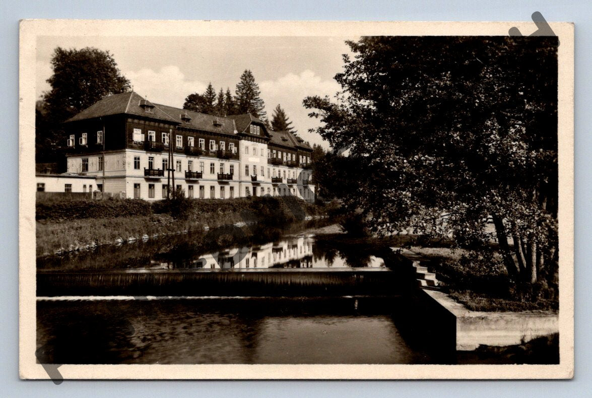 Starožitná černobílá pohlednice zobrazující lázeňský komplex Janské koupele - Staré Těchanovice s útulnou budovou u vodního toku. Pohlednice je adresována do Brna a datována razítkem z roku 1953. Na zadní straně je známka Československa s hodnotou 30h. Pohlednice je v dobrém stavu s mírnými známkami stáří. Ideální sběratelský kousek pro milovníky historie, českých lázní a starých fotografií.