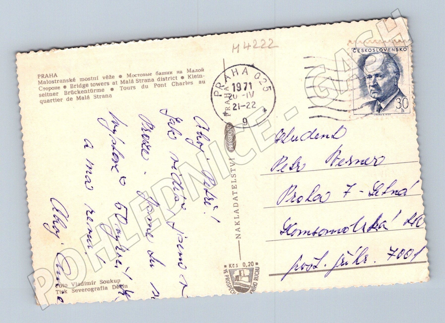 Originální historická pohlednice z Prahy zachycující Malostranské mostní věže na Karlově mostě. Pohlednice je barevná, okraje mají typické zoubkování. Na zadní straně je ručně psaný vzkaz, poštovní známka s portrétem a razítko z roku 1971. V textu najdete krátký popis motivu v několika jazycích. Pohlednice je krásnou ukázkou korespondence své doby a má sběratelskou hodnotu, včetně známky a razítka. Skvělý přírůstek do sbírky starých pohlednic Prahy či Československa.