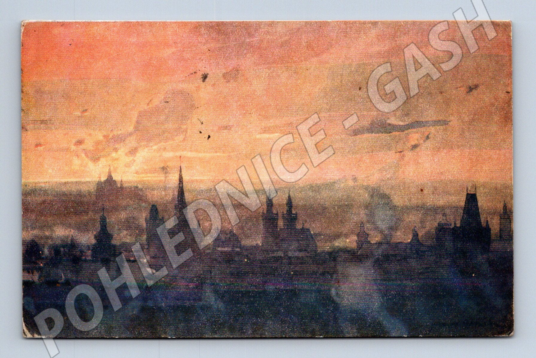 Pohlednice Praha – panorama a věže při západu slunce, 1920, Československo