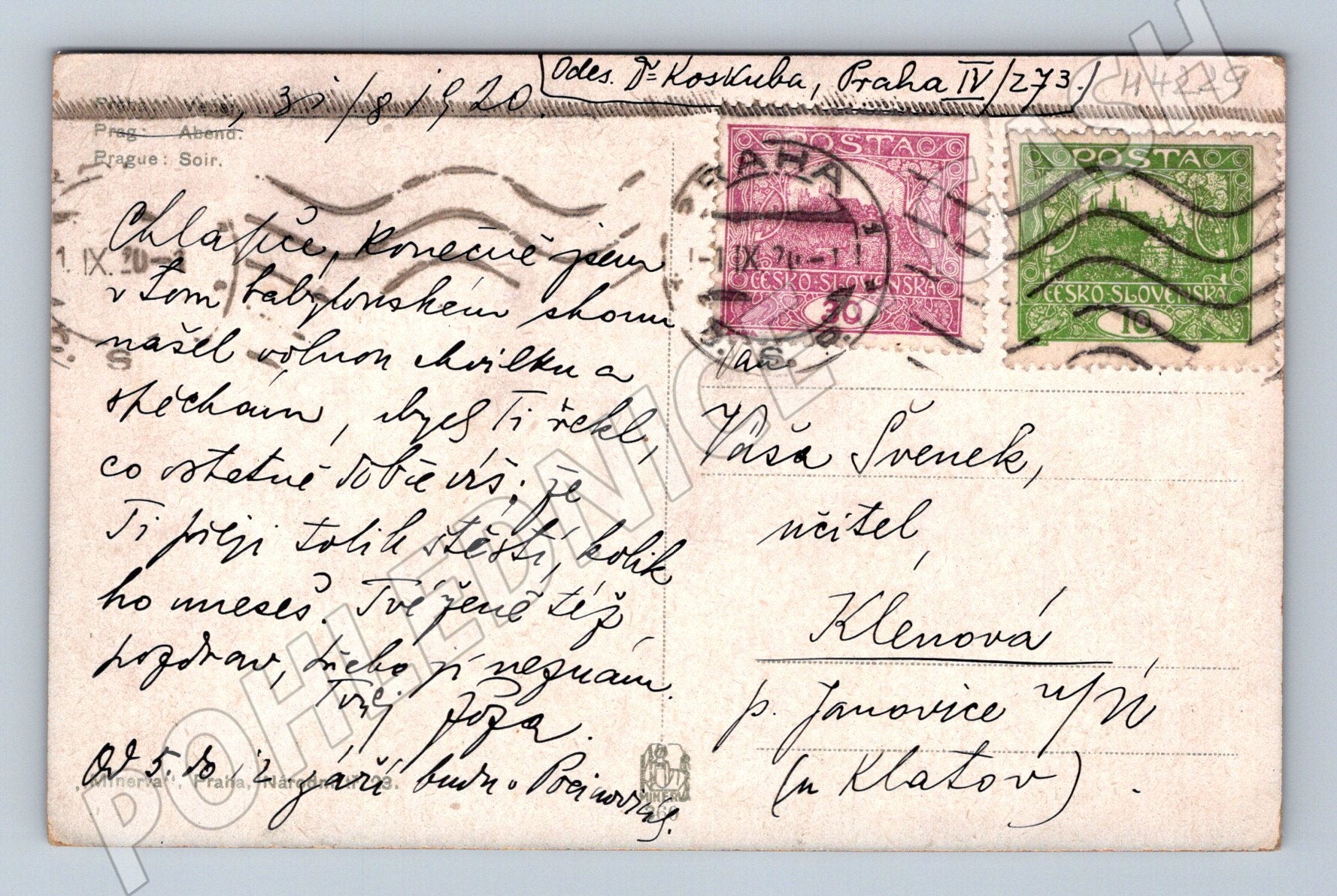 Originální stará pohlednice s motivem pražských věží a panoramatu při západu slunce, malovaný efekt. Na zadní straně je rukou psaná zpráva a dvě československé poštovní známky z období první republiky. Pohlednice byla odeslána v roce 1920 z Prahy, což dokládá poštovní razítko. Ideální pro sběratele historických pohlednic nebo jako dekorativní předmět. Stav zboží odpovídá stáří – malé známky opotřebení na okrajích.