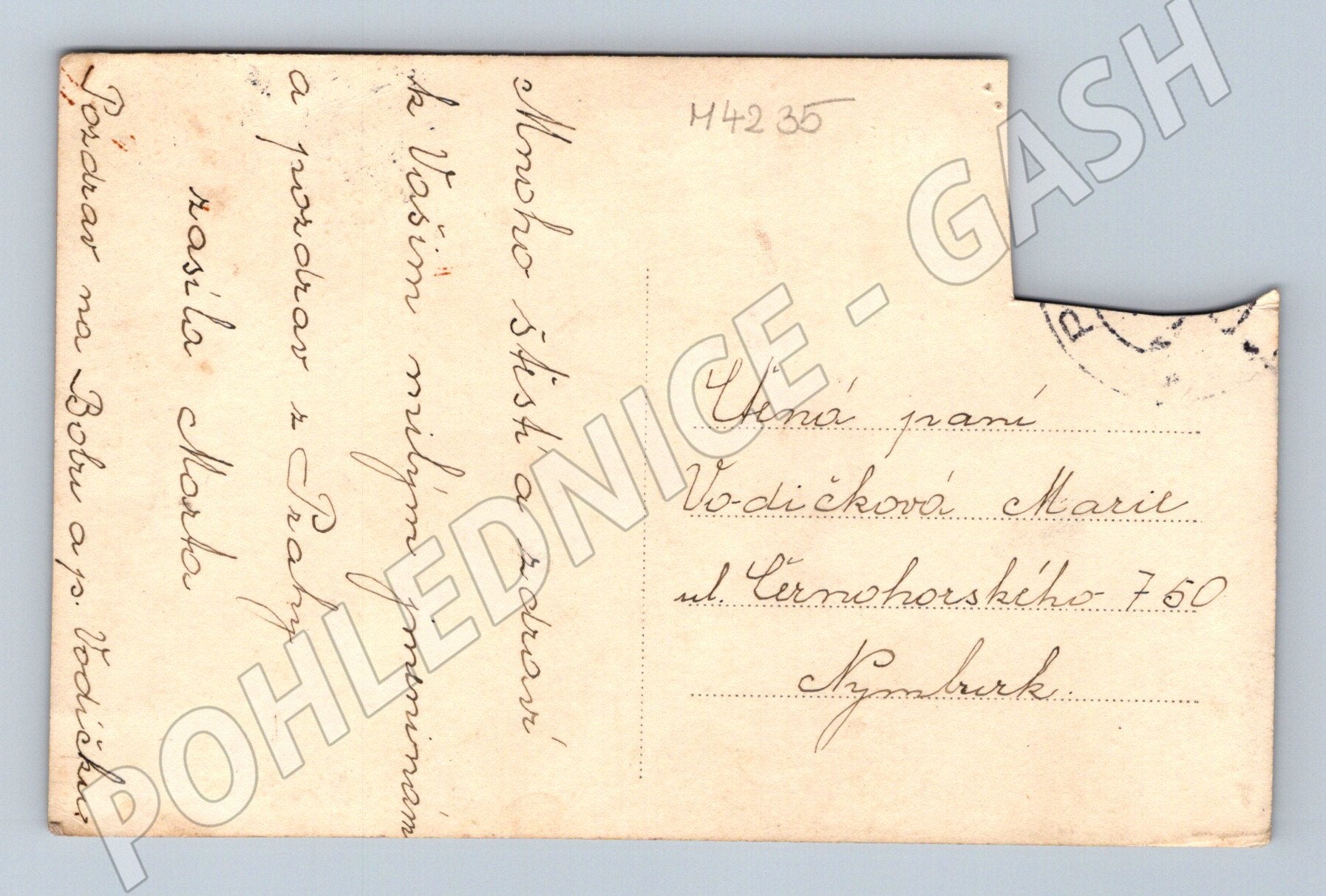 Originální historická pohlednice s vyobrazením Prahy – Hradčan. Pohlednice je malého formátu a její stáří spadá do období před rokem 1950. Na přední straně pohlednice je černobílá fotografie Hradčan s výhledem na Pražský hrad a chrám sv. Víta. Zadní strana je popsaná, adresovaná paní Marii Vodičkové do Nymburka a je opatřena rukopisným textem. Pohlednice má mírně poškozené rohy (chybí části v rozích), což odpovídá jejímu stáří a běžnému opotřebení. Jedná se o sběratelsky atraktivní kousek dokumentující architekturu a atmosféru meziválečné Prahy.
