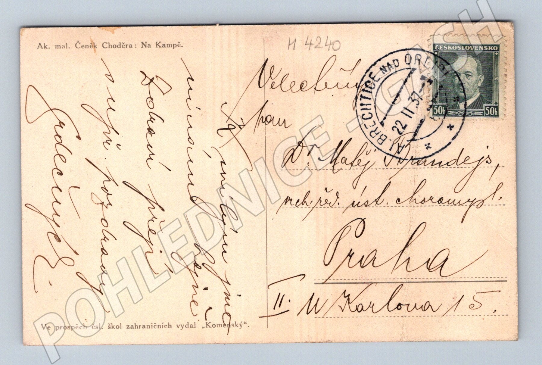 Staropražská pohlednice Na Kampě, Čeněk Choděra, 1937, malý formát
