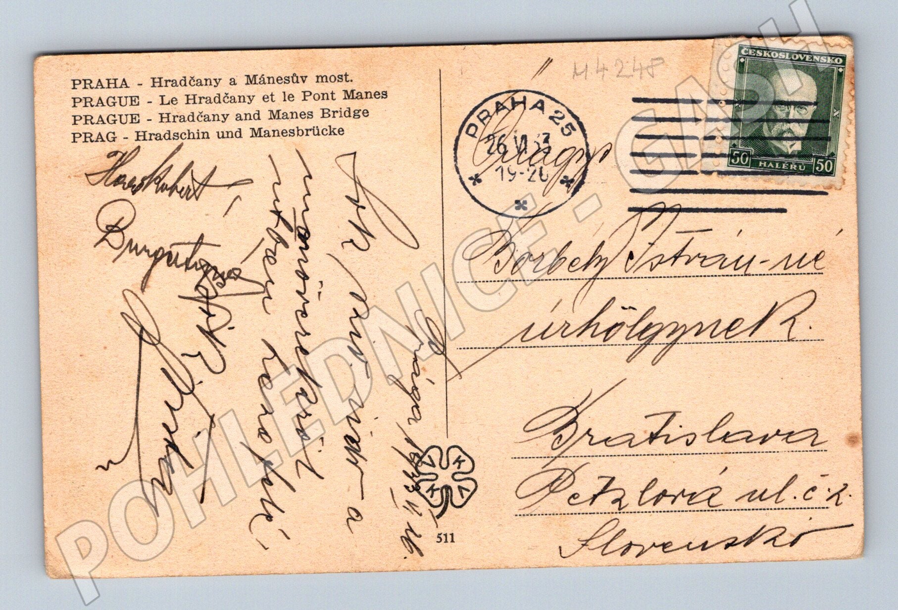 Praha Hradčany a most – stará pohlednice 1926, malý formát
