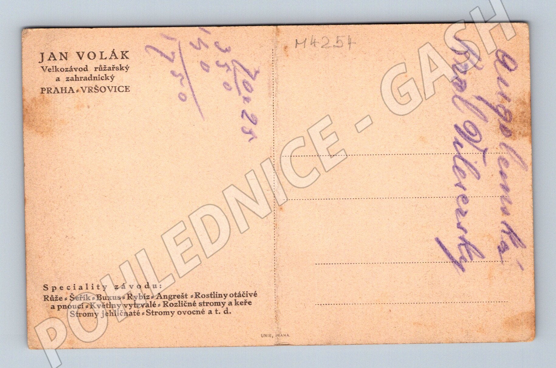 Originální historická pohlednice s názvem Volákův růžový sad na pražském výstavišti zachycuje slavnostní sad, který byl součástí pražského výstaviště. Na přední straně je krásný pohled na upravený park s růžemi, cestičkami a výstavní bránou s nápisem Volák . Jedná se o dobový snímek významného zahradnického areálu spojeného s jménem Jan Volák, zahradník z Prahy-Vršovic, jehož podnik byl známý pěstováním růží, keřů a dalších okrasných i ovocných rostlin. Zadní strana obsahuje krátkou reklamní informaci a je popsána tužkou. Pohlednice je ve velmi dobrém sběratelském stavu, s patinou odpovídající svému stáří. Skvělý přírůstek do sbírky pohlednic s motivy Prahy a historických zahrad.