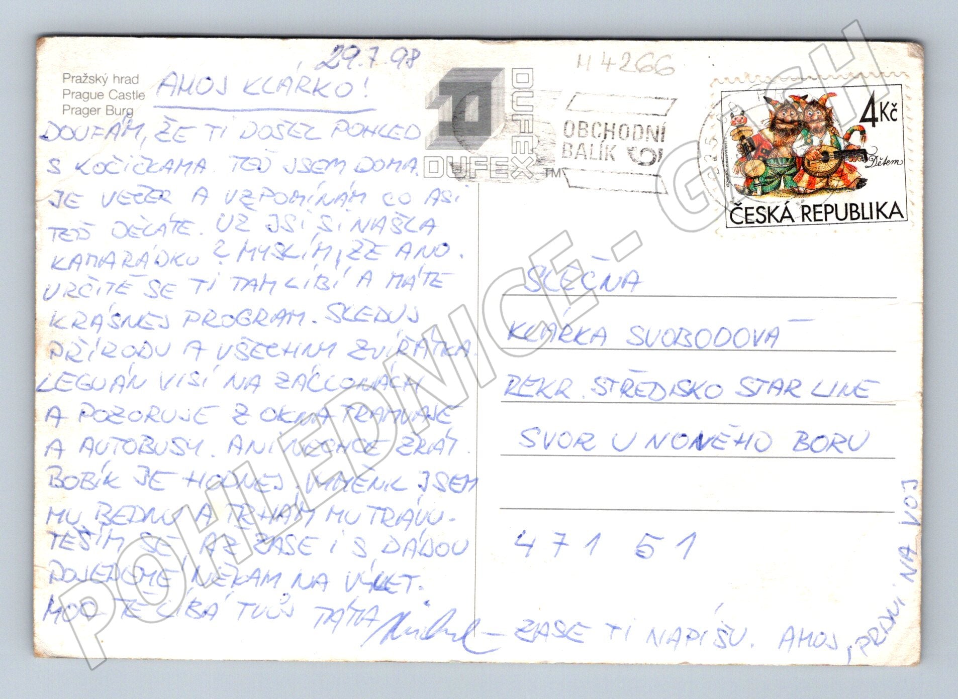Originální stará pohlednice s vyobrazením Pražského hradu a Karlova mostu v Praze. Na přední straně je krásný pohled na historické památky s řekou Vltavou v popředí. Zadní strana obsahuje ručně psané poselství, adresu, známku a razítko z České republiky. Pohlednice je v dobrém stavu odpovídajícím stáří, rohy mírně otřené, povrch s typickými znaky opotřebení. Skvělý sběratelský kousek pro milovníky historie Prahy, architektury či poštovní historie. Vhodné také jako dekorace nebo originální dárek.