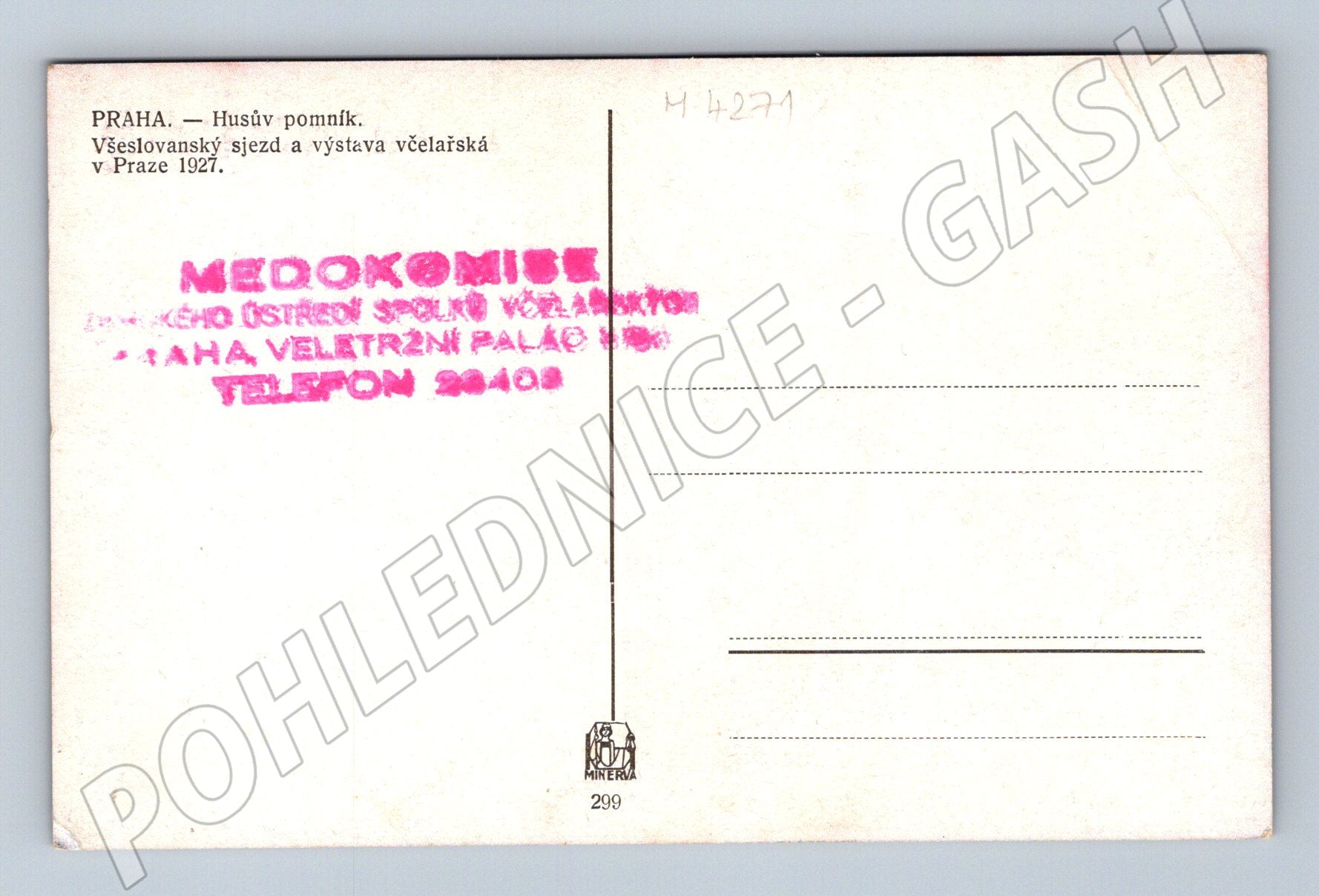 Originální stará pohlednice zobrazující Husův pomník v Praze (Staroměstské náměstí). Na zadní straně se nachází popis: PRAHA. — Husův pomník. Všeslovanský sjezd a výstava včelařská v Praze 1927. Pohlednice je opatřena razítkem MEDOKOMISE PRAŽSKÉHO ÚSTŘEDÍ SPOJŮ VČELAŘSKÝCH PRAHA VELETRŽNÍ PALÁC TELEFON 28408 . Velmi pěkný kolorovaný tisk, běžné známky stáří. Skvělý sběratelský kousek s historickým motivem významné pražské památky. Stav viz foto.