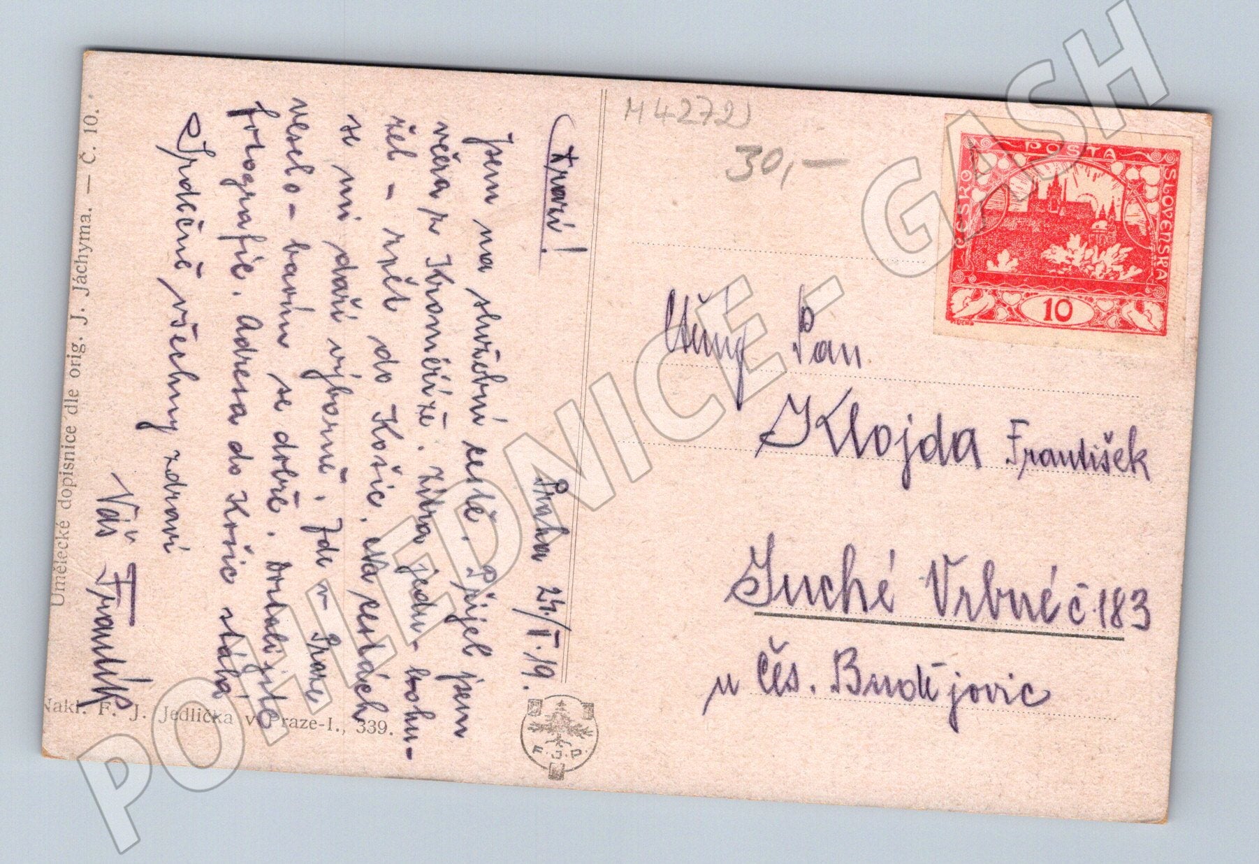 Nabízím krásnou historickou pohlednici s motivem Pražského hradu a Hradčan v Praze. Pohlednice je ilustrovaná a zachycuje Pražský hrad pohledem přes Hradčanské údolí v zimním období, což dokresluje jemná barevnost a unikátní atmosféra této slavné památky. Na zadní straně je ručně psaný text s poštovním razítkem a známkou z období první republiky, datováno rokem 1919. Jedná se o hodnotný sběratelský kousek jak pro milovníky historie, tak pro sběratele pohlednic historických památek České republiky.