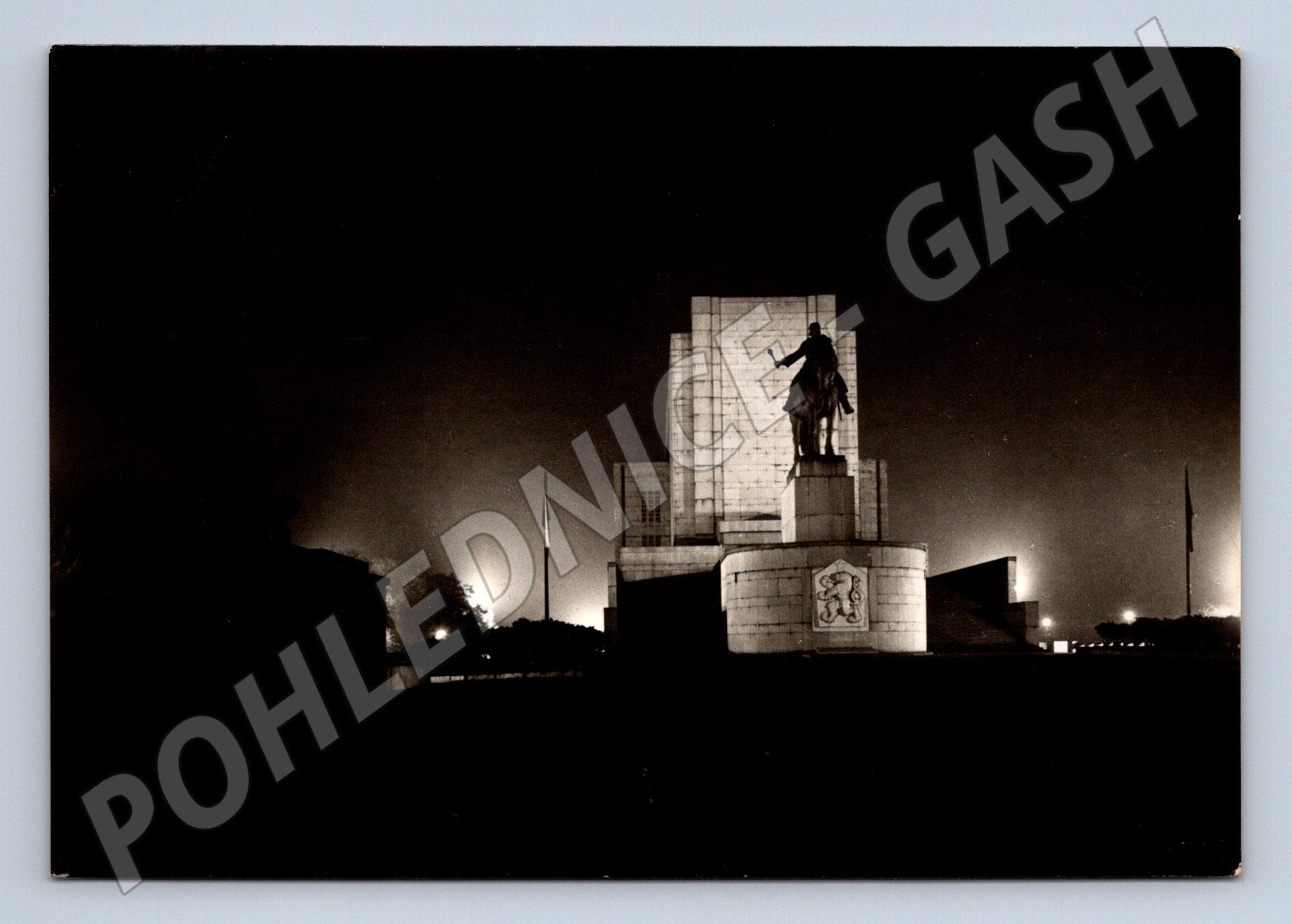 Historická černobílá pohlednice zachycující Národní památník na Vítkově v Praze v noční atmosféře. Na přední straně dominuje monumentální jezdecká socha Jana Žižky a památník osvětlený reflektory, které zvýrazňují jeho majestátnost. Zadní strana je popsána a opatřena známkou Československo s razítkem, odeslaná v období první poloviny 20. století. Vhodné pro sběratele historických pohlednic, zájemce o památky a historii Prahy.