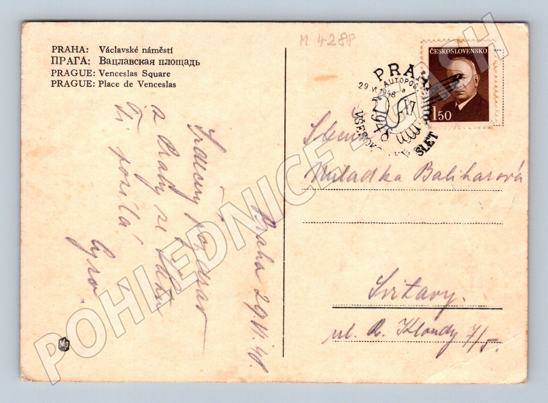 Originální stará pohlednice zobrazující slavné Václavské náměstí v Praze s provozem typických tramvají a automobilů té doby. Pohlednice pochází z období před rokem 1950, je použita – opatřena známkou Československo s portrétem prezidenta Edvarda Beneše a poštovním razítkem z roku 1948. Na zadní straně naleznete adresu, krátký rukopisný vzkaz a standardní popis místa ve více jazycích. Pohlednice je ve velmi dobrém sběratelském stavu s drobnými známkami stáří po okrajích. Výjimečný kousek pro milovníky historické Prahy a starých dopravních prostředků.
