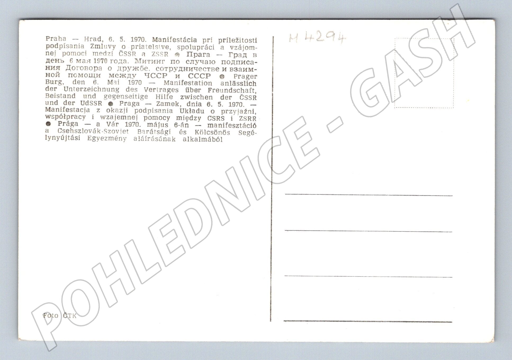 Pohlednice zachycuje manifestaci na Pražském hradě dne 6. května 1970 při příležitosti podpisu Smlouvy o přátelství, spolupráci a vzájemné pomoci mezi ČSSR a SSSR. Na obrázku je dav lidí s vlajkami a transparenty, na budově je umístěn nápis Se Sovětským svazem na věčné časy a nikdy jinak . Na balkóně jsou tehdejší státní představitelé. Jedná se o dobovou černobílou pohlednici, která je svědkem významných politických událostí období normalizace v Československu. Pohlednice je nepopsaná, ve velmi dobrém stavu. Vhodné pro sběratele historických a politických materiálů.