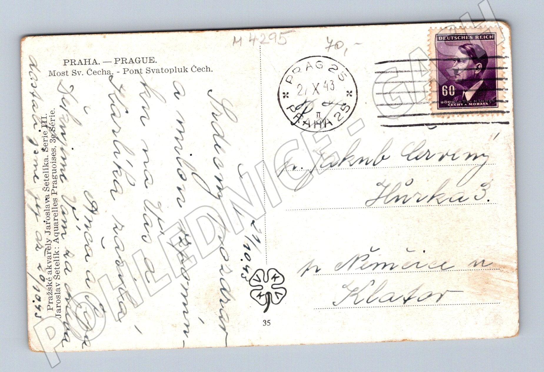 Historická pohlednice zobrazuje Most Svatopluka Čecha v Praze s malovaným pohledem na panorama města včetně Pražského hradu a okolní zeleně. Pohlednice je datována rokem 1943, což dokládá razítko a známka s portrétem na zadní straně. Jedná se o malý formát typický pro období první poloviny 20. století. Pohlednice je použita (prošlá poštou), v zachovalém stavu s drobnými stopami stáří a lehkým opotřebením na okrajích. Atraktivní sběratelský kus s krásnou kresbou Jaroslava Šetelíka a autentickou historickou známkou z období protektorátu Čechy a Morava.