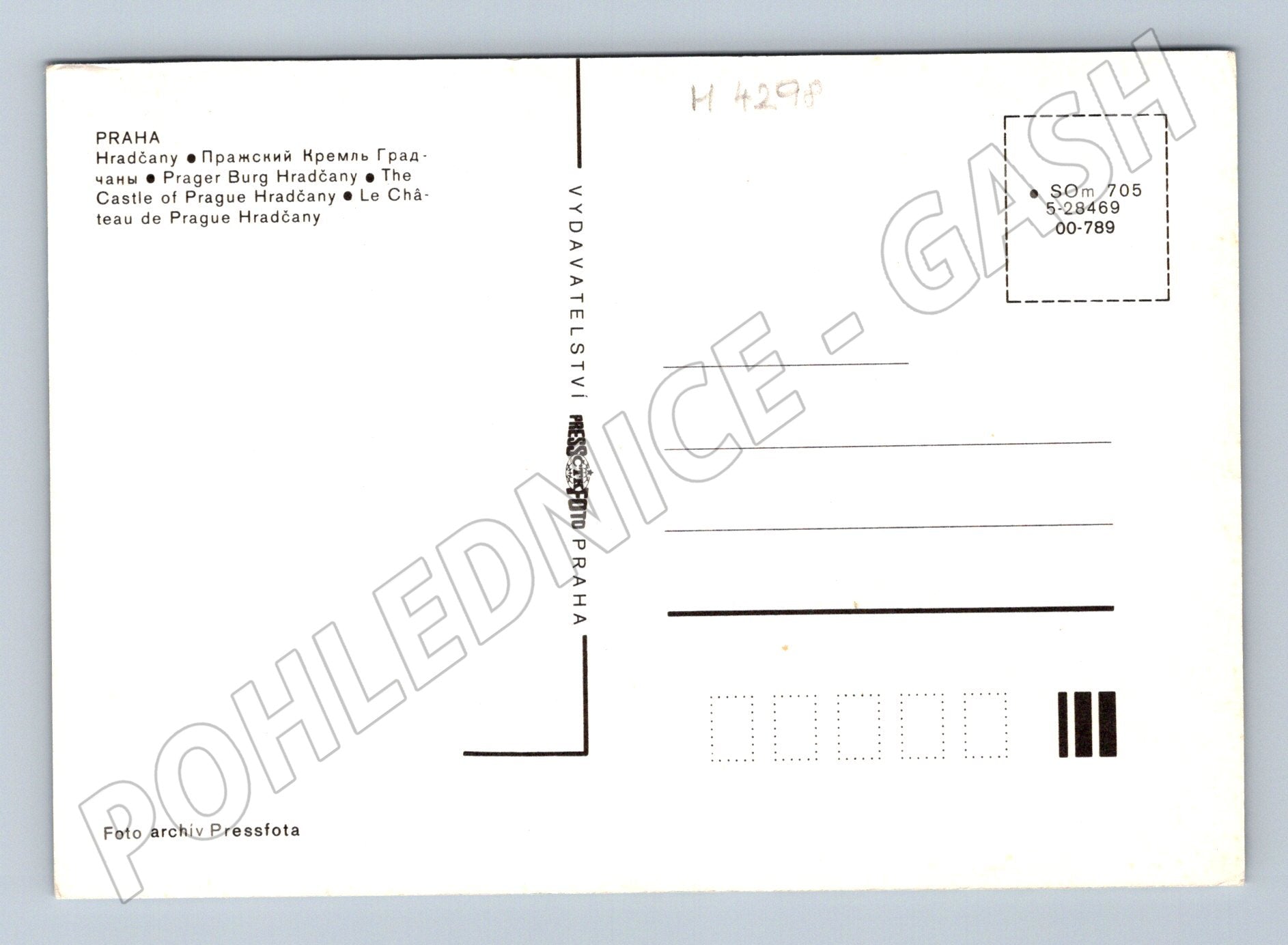 Originální barevná pohlednice znázorňující zimní panorama Prahy s výhledem na Hradčany a Pražský hrad. Na přední straně pohlednice je pohled na zasněžené střechy Malé Strany s dominantou katedrály sv. Víta. Jedná se o velkoformátovou pohlednici, jež byla vydána nakladatelstvím Pressfoto Praha. Zadní strana obsahuje popis v několika jazycích a místo pro známku a adresu. Pohlednice nebyla použita, je velmi dobře zachovalá, bez viditelných poškození nebo skvrn. Perfektní do sbírky nebo jako nostalgická dekorace.