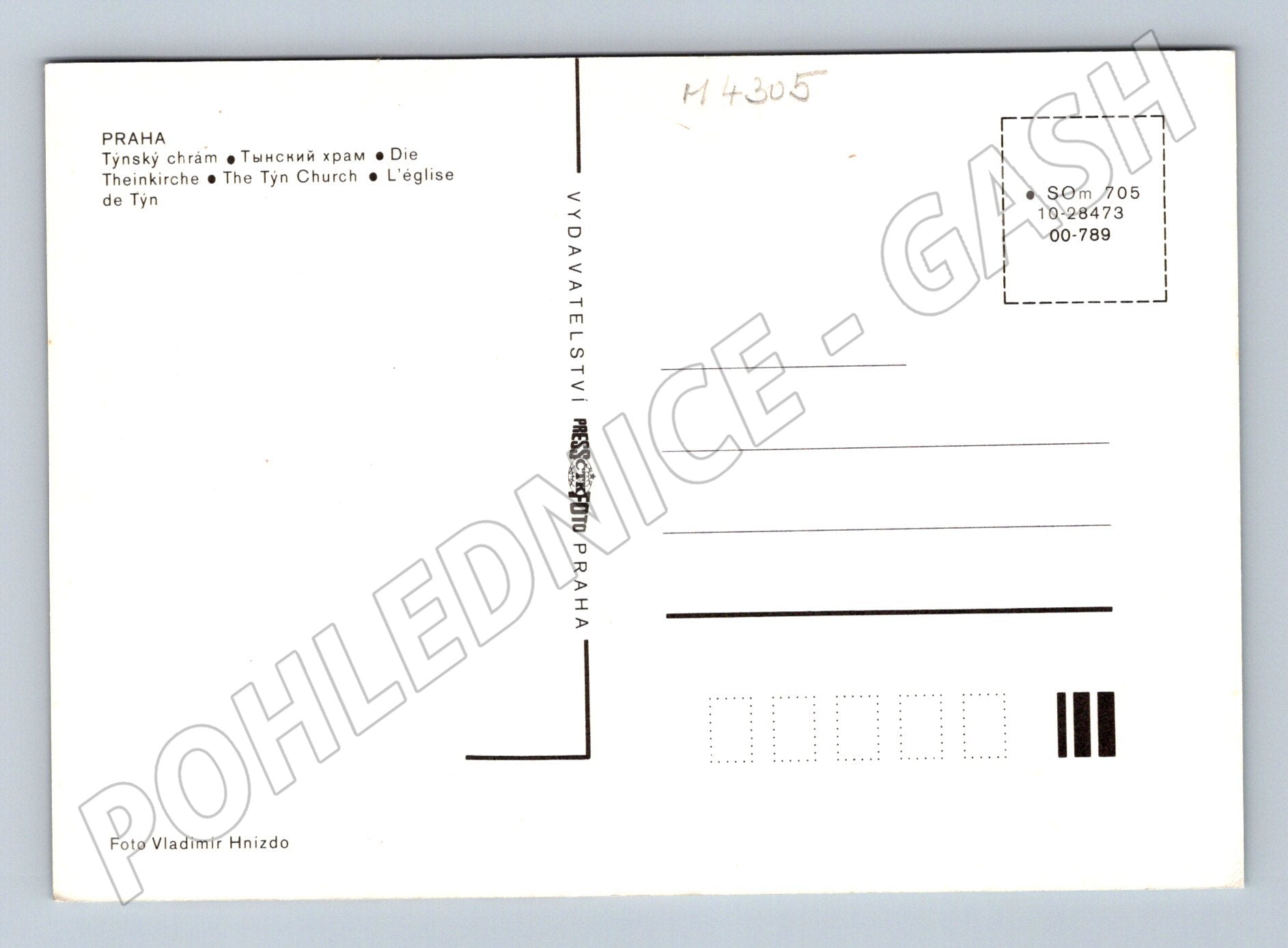 Originální pohlednice s motivem Týnského chrámu na Staroměstském náměstí v Praze. Pohlednice zachycuje zimní atmosféru historického centra s dominantou gotického kostela a okolní architekturou pod sněhem. Text v různých jazycích na zadní straně: PRAG, Týnský chrám, The Tyn Church aj. Foto: Vladimír Hnizdo. Neprošlá poštou, velmi pěkný stav, vhodné pro sběratele nebo milovníky Prahy.