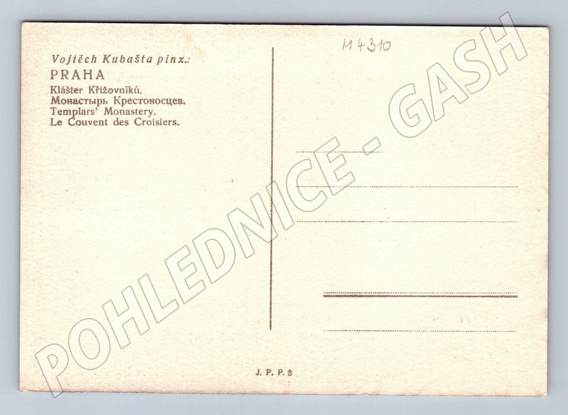 Starší pohlednice Prahy s uměleckým vyobrazením Kláštera křížovníků, jejímž autorem je Vojtěch Kubašta. Na přední straně je detailní kresba pohledu na klášter a okolní část staré Prahy, s řekou Vltavou a dominantou historických budov. Zadní strana obsahuje popisky v několika jazycích – česky, rusky, anglicky i francouzsky. Pohlednice nebyla použita, rohy mírně opotřebené odpovídající stáří. Atraktivní sběratelský kousek vhodný pro milovníky historických pohlednic a staré Prahy.