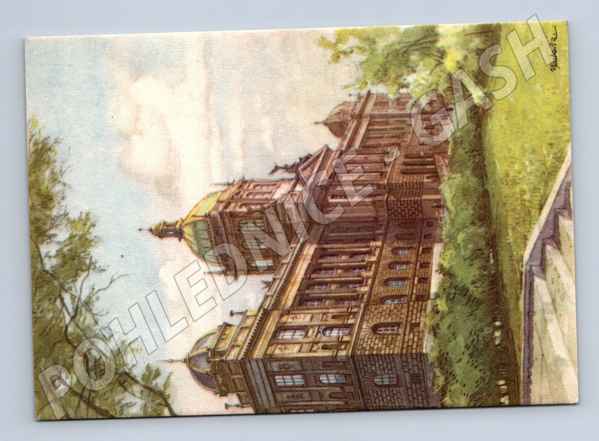 Originální historická pohlednice s motivem Národního muzea v Praze. Autorem kresby je známý český ilustrátor Vojtěch Kubašta. Pohlednice je neprošlá, ve velmi dobrém sběratelském stavu, bez popisu na zadní straně. Text na zadní straně ve více jazycích (česky, rusky, anglicky, francouzsky). Výjimečný sběratelský kousek z období první poloviny 20. století, vhodný do sbírky pražských památek nebo tématických pohlednic.