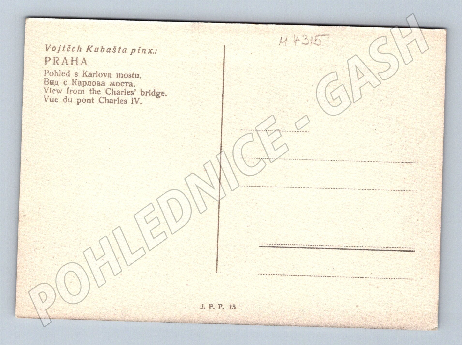Originální historická pohlednice s názvem Pohled z Karlova mostu od výtvarníka Vojtěcha Kubašty. Pohlednice zobrazuje romantický pohled z Karlova mostu v Praze s výhledem na Pražský hrad a Malou Stranu. Kvalitní malířské zpracování, na zadní straně vícejazyčný popis: View from the Charles bridge . Pohlednice neprošlá poštou, ve velmi dobrém sběratelském stavu. Vhodné pro sběratele pražských pohlednic či milovníky historie a architektury. Rozměr malého formátu, předpokládané vydání do roku 1950. Čistá zadní strana, evidenční číslo: J.P.P. 815.