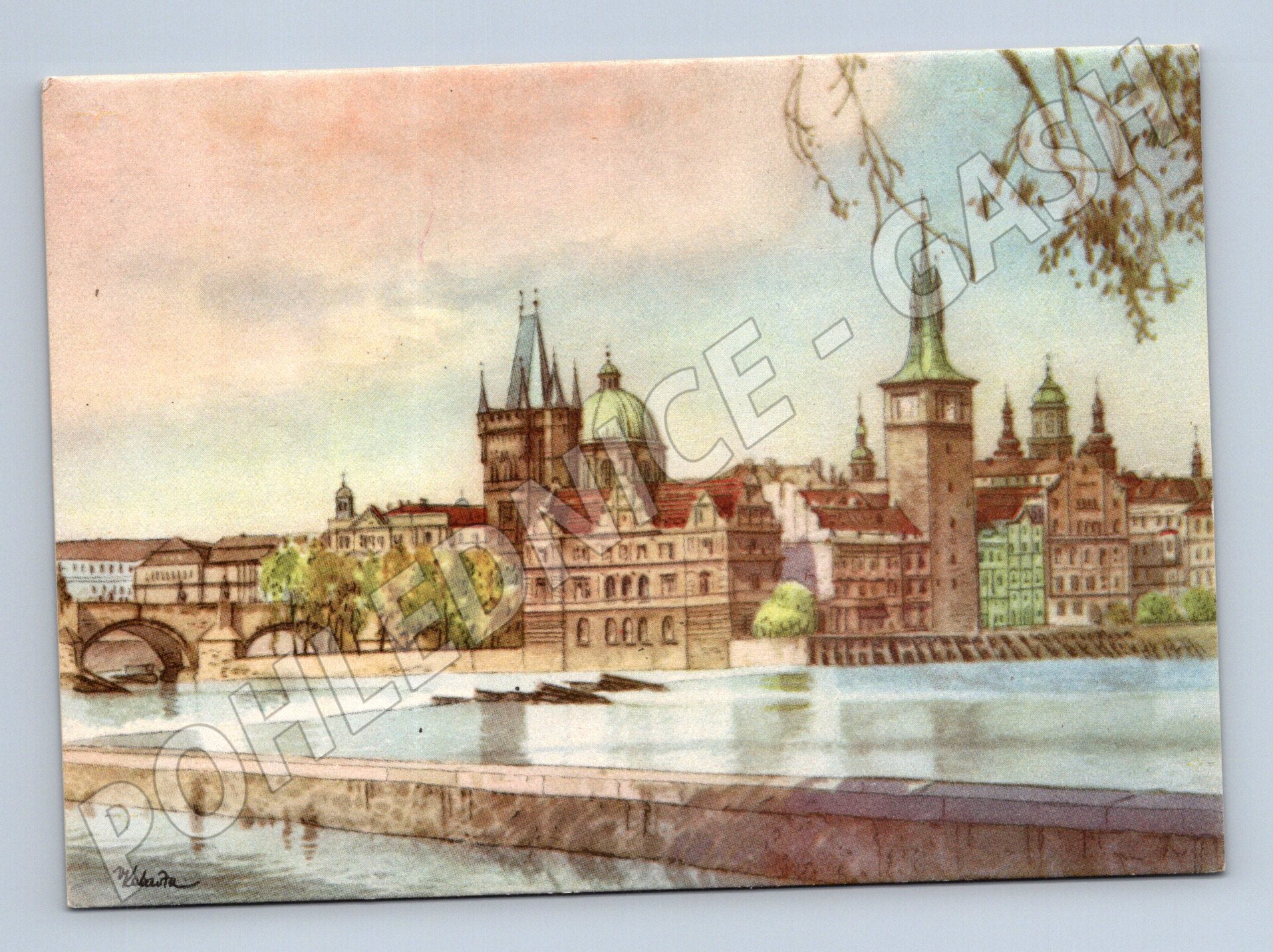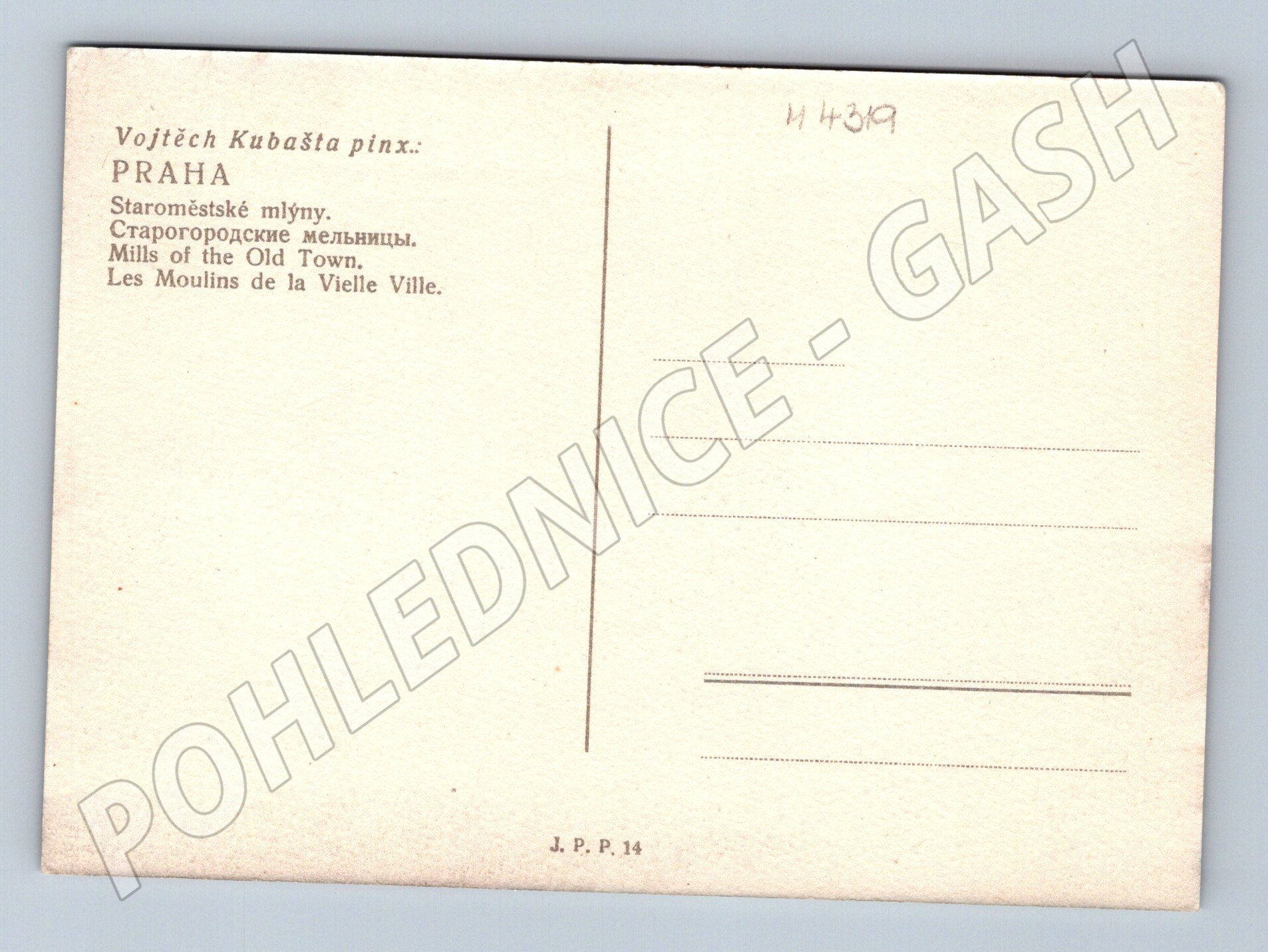 Originální stará pohlednice zobrazující Staroměstské mlýny v Praze, od známého českého výtvarníka Vojtěcha Kubašty. Pohlednice je s krásným kolorovaným motivem historického centra Prahy a Karlova mostu. Na zadní straně je vícejazyčný popis (čeština, ruština, angličtina, francouzština) a označení J.P.P.14. Velmi dobrý sběratelský stav, ručně podepsáno autorem. Pohlednice je neprošlá poštou, bez známky a razítka. Jedná se o malý formát typický pro období do roku 1950.