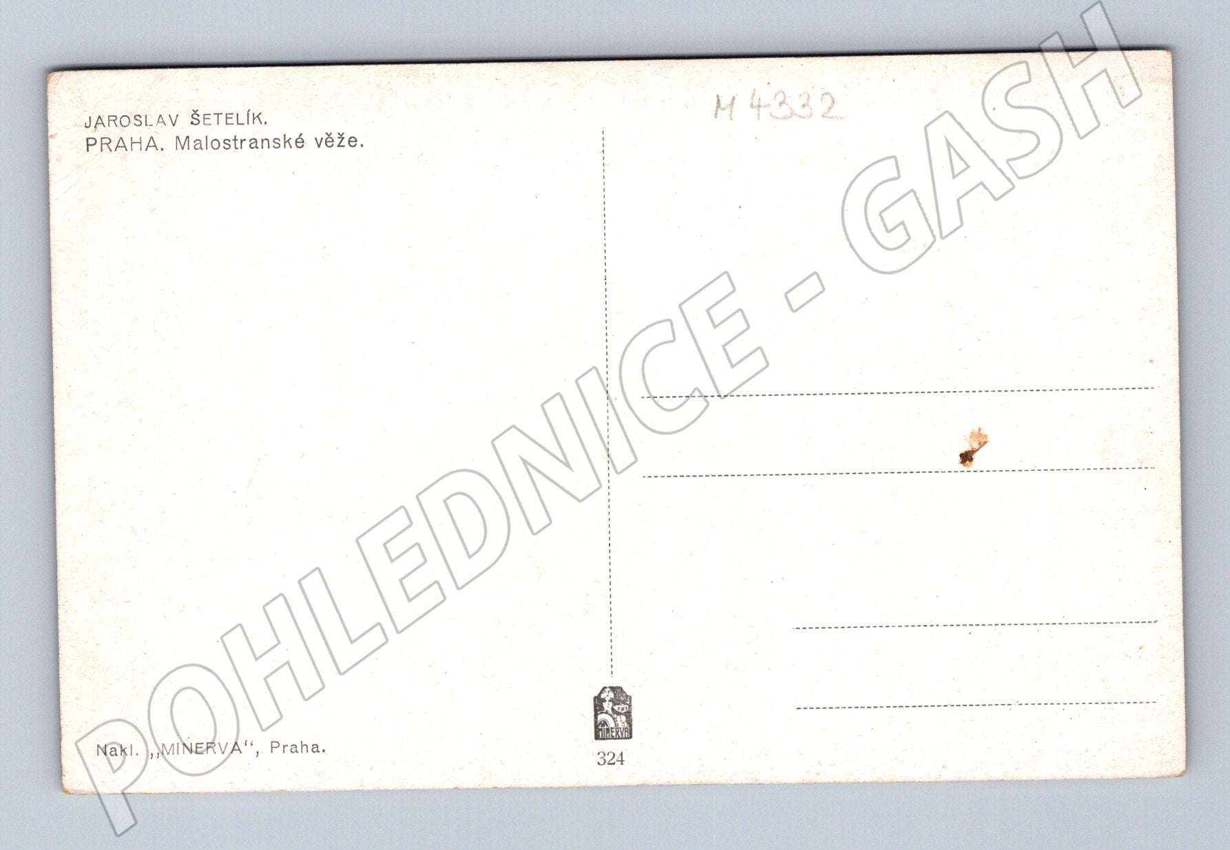 Originální pohlednice zobrazující Malostranské věže v Praze od malíře Jaroslava Šetelíka. Krásné umělecké zpracování s romantickým pohledem na historickou část Prahy. Pohlednice vydána nakladatelstvím MINERVA v Praze, přední strana s barevným tiskem, zadní strana s popisem a místem pro známku a adresu. Ocení zejména sběratelé starých pražských pohlednic a zájemci o umělecky ztvárněné motivy města. Dobový stav – viz foto.