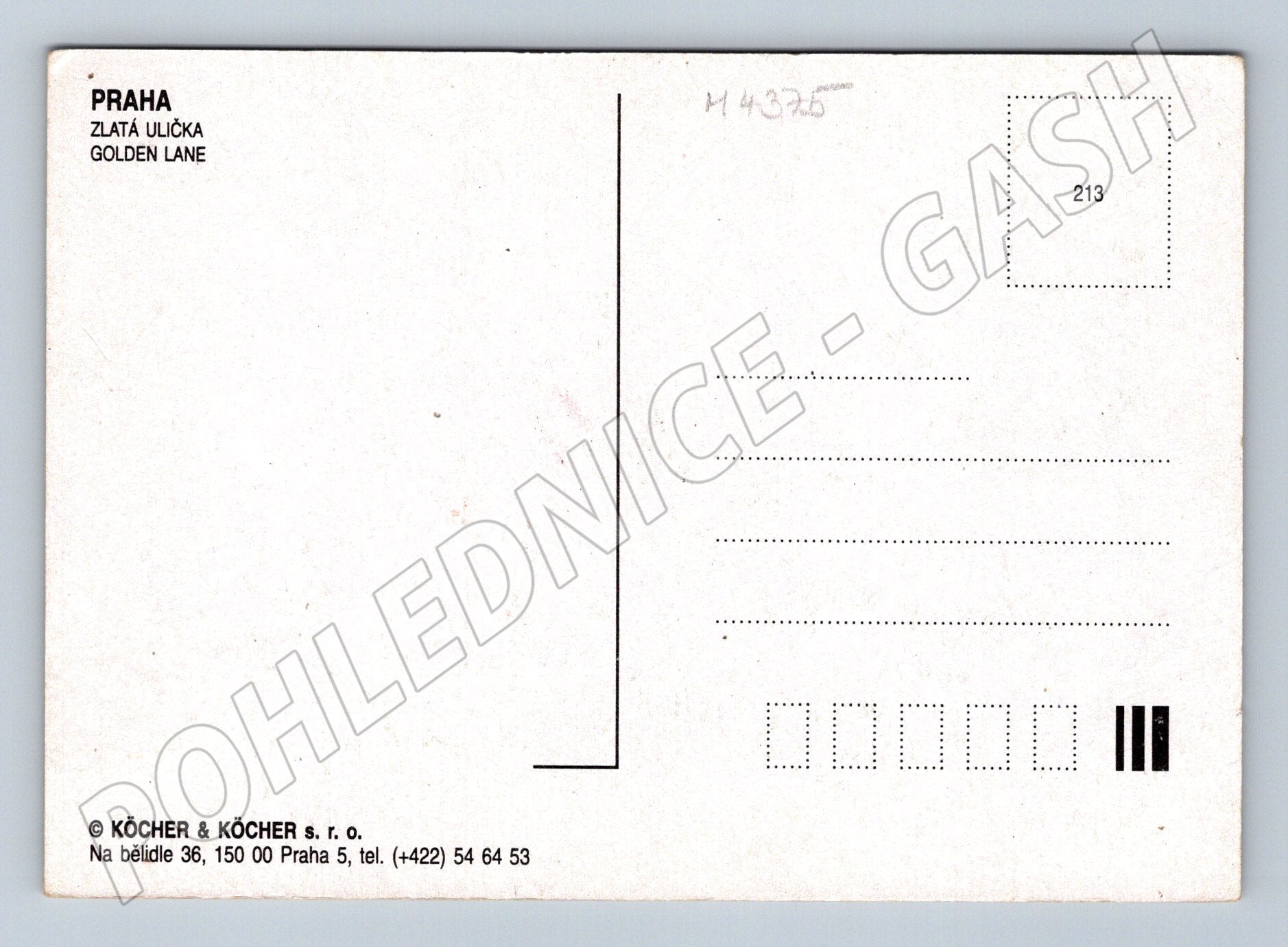 Pohlednice zachycuje slavnou Zlatou uličku v Praze. Tato malebná ulička se nachází na Pražském hradě a je známá svými malými domky a jedinečnou atmosférou historického centra Prahy. Na pohlednici je pohled do samotné uličky s dobovými detaily, včetně klasických pouličních lamp a typických architektonických prvků. Tato pohlednice je tiskem společnosti Köcher & Köcher a jedná se o sběratelský kousek ideální pro milovníky Prahy, historické architektury i sběratele pohlednic. Zadní strana připravena k odeslání, včetně místa pro známku a adresu.