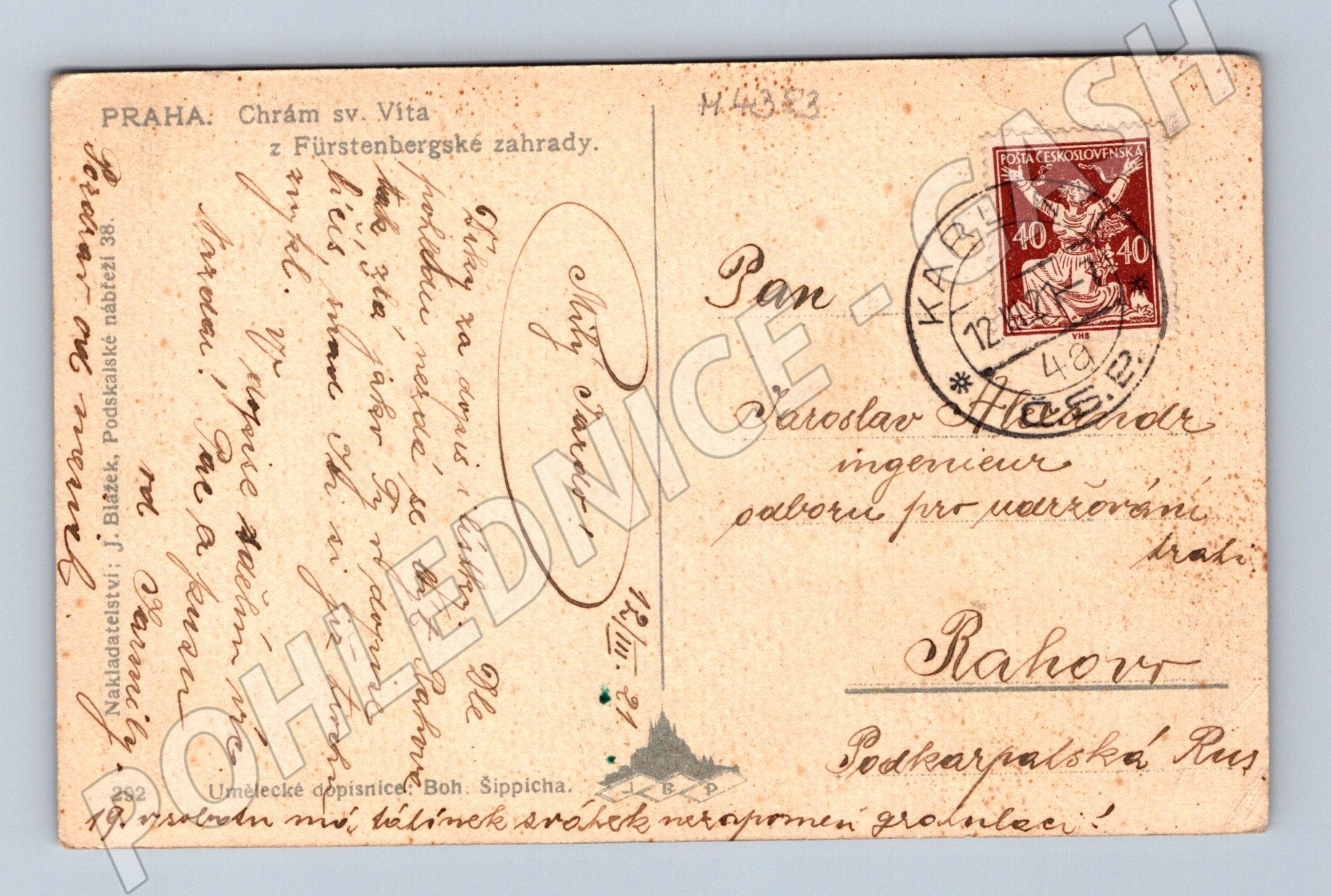 Starobylá pohlednice s výtvarným ztvárněním Chrámu sv. Víta v Praze z Fürstenberské zahrady od malíře Bohumila Šippicha. Barevná ilustrace s dekorativním okrajem, krásná ukázka umělecké tvorby pohlednic z první poloviny 20. století. Na zadní straně naleznete rukopisný text i poštovní známku Československa v hodnotě 40 haléřů a jasné poštovní razítko Karviná z roku 1948, což dokládá skutečný historický kontext této korespondence. Pohlednice pochází z edice Umělecké dopisnice. Výborný sběratelský stav, ideální pro milovníky starých Pražských motivů či sběratelství pohlednic z období první republiky.