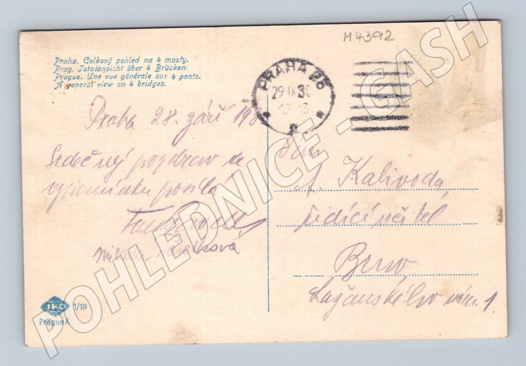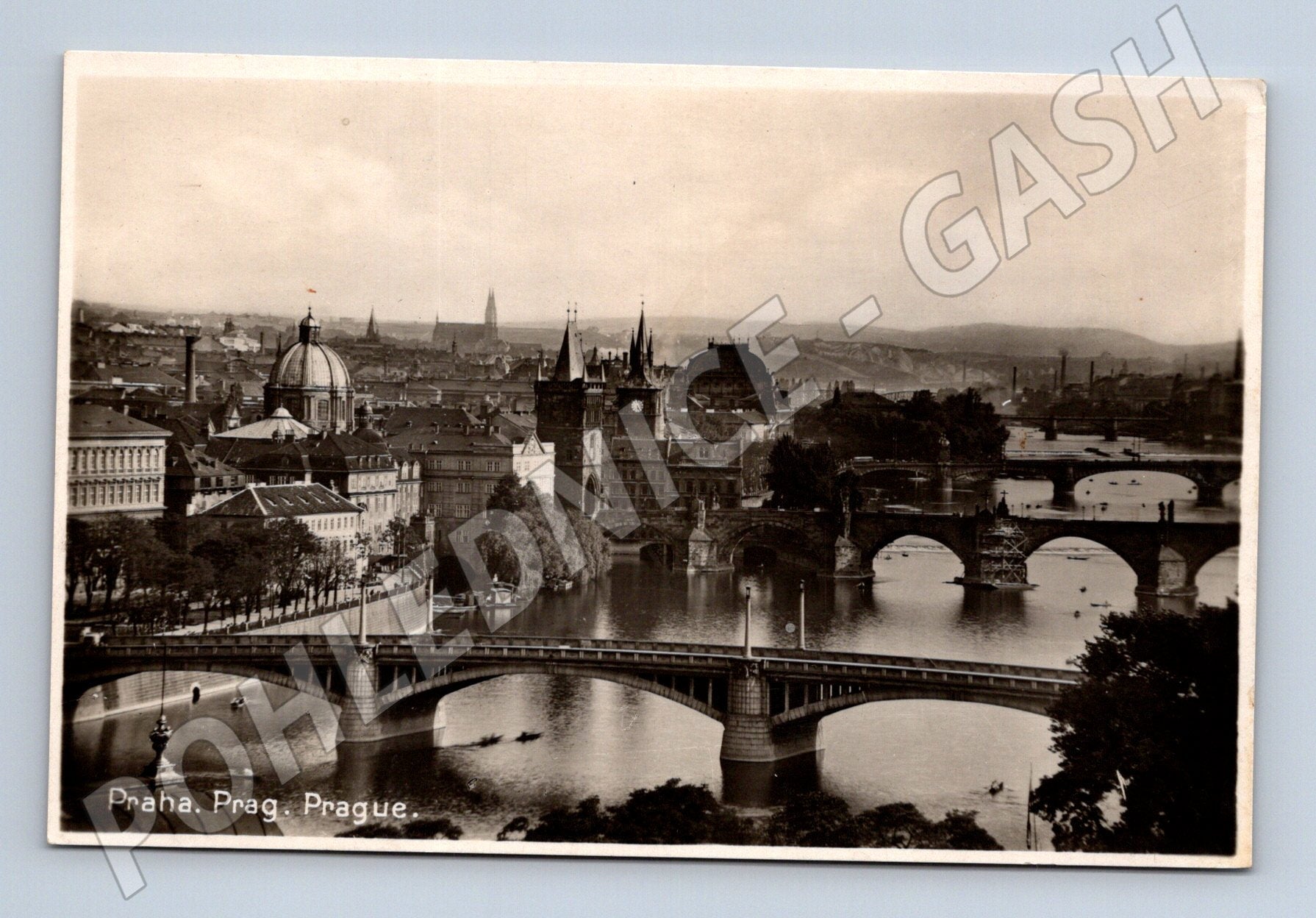 Starobylá pohlednice z období před rokem 1950 s černobílým motivem panoramatu Prahy a pohledem na slavné pražské mosty přes Vltavu, včetně Karlova mostu. Na přední straně je uveden nápis „Praha. Prag. Prague.”, ve spodní části. Zadní strana s ručně psaným textem, poštovní známkou a razítkováním z roku 1936. Pohlednice je v dobrém sběratelském stavu, lehké opotřebení odpovídající stáří, skvělý doplněk každé sbírky historických pohlednic z ČR, nebo suvenýr z Prahy. Formát malý, vydavatel JKO Prague X.