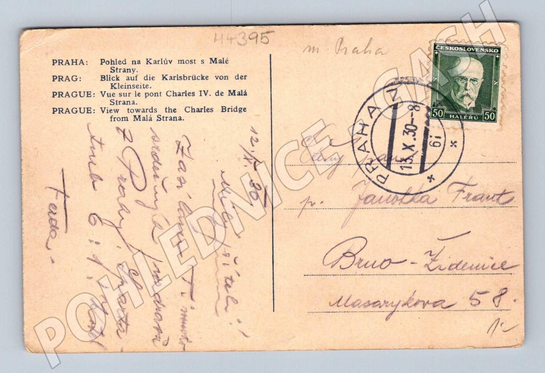 Historická pohlednice z období první poloviny 20. století s kolorovaným pohledem na Karlův most a Pražský hrad z Malé Strany. Na zadní straně naleznete popis v několika jazycích (česky, německy, francouzsky a anglicky), známku a razítko s datem 12. IX. 1930. Pohlednice je ve sběratelském stavu s drobnými stopami stáří. Výborná ukázka dobové korespondence a pražské architektury před více než 90 lety. Vhodné pro sběratele historických pohlednic a zájemce o Prahu.