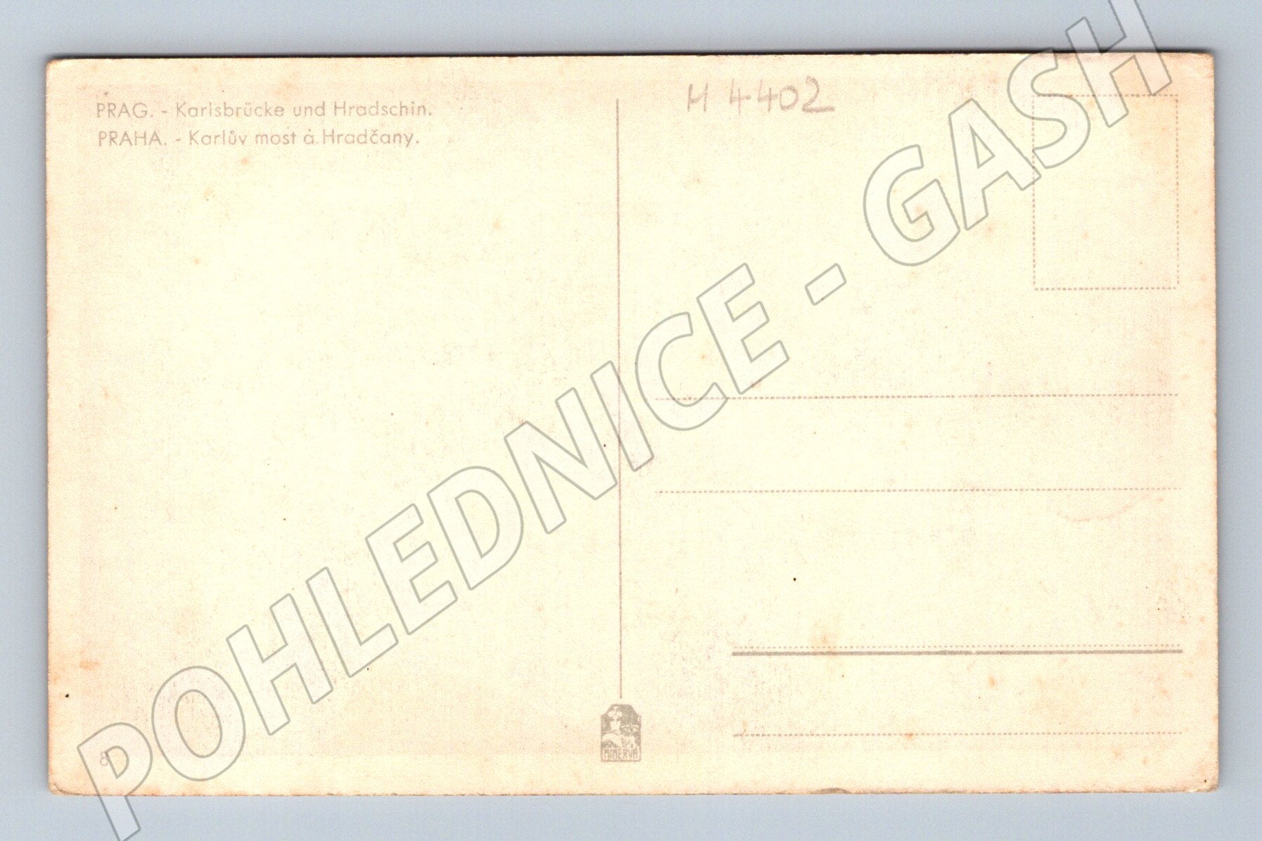 Originální stará pohlednice z období první poloviny 20. století s motivem Prahy – Karlův most a panorama Hradčan. Pohlednice nese popis v češtině i němčině: PRAHA – Karlův most a Hradčany / PRAG – Karlsbrücke und Hradschin . Jedná se o černobílou fotografii, která zachycuje ikonickou pražskou architekturu a atmosféru tehdejší doby. Zadní strana je nepopsaná, bez známky, s drobnými známkami stáří a opotřebení především v rozích. Výborný sběratelský kousek pro milovníky historických pohlednic, Prahy a české historie.