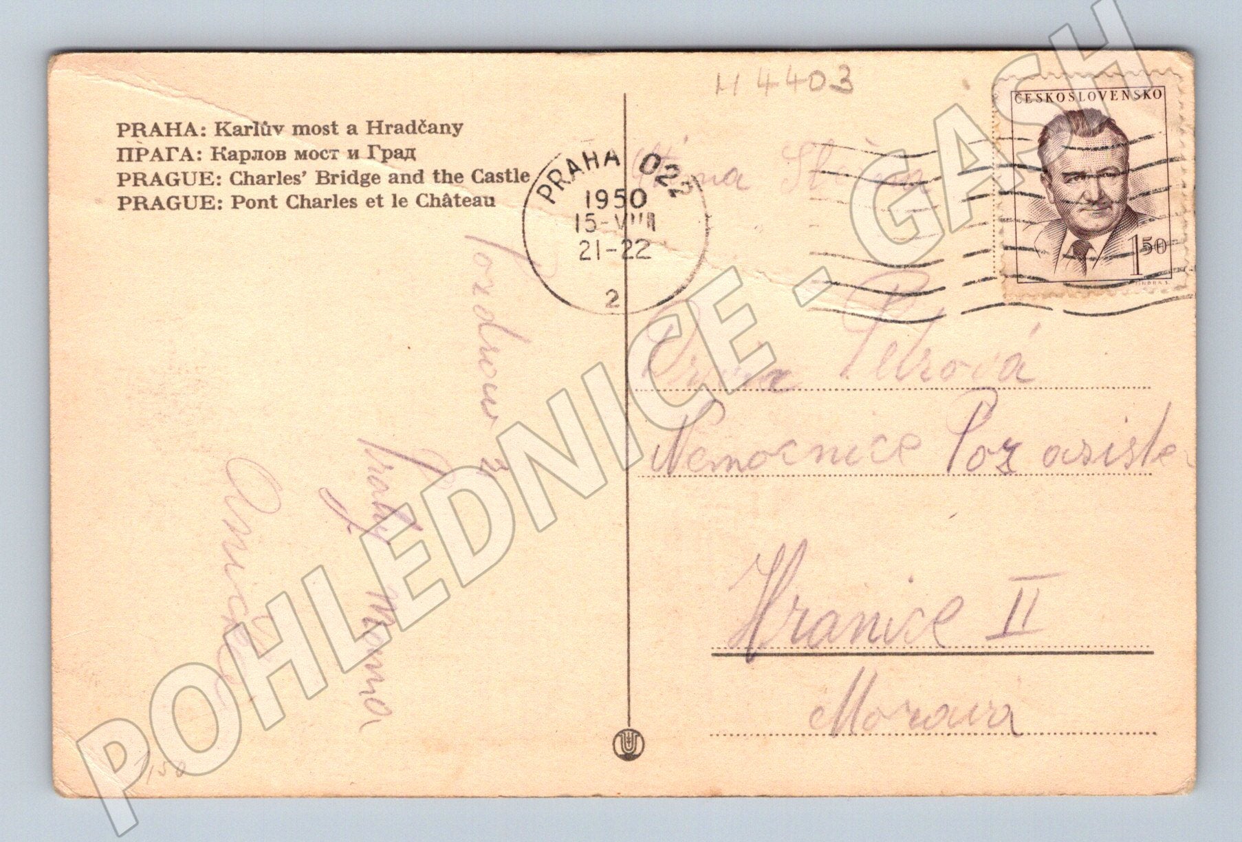 Praha - Karlův most a Hradčany, pohlednice 1950, známka