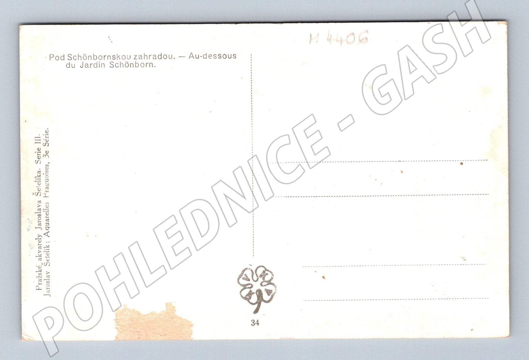Originální pohlednice s motivem pod Schönbornskou zahradou v Praze. Pohlednice je reprodukcí akvarelu malíře Jaroslava Šetelíka a patří do série Pražské akvarely. Formát malý, typické pro období do roku 1950. Na přední straně naleznete krásně zpracovanou malbu s pohledem na pražskou scenérii s dominantou památkových budov a stromů v popředí. Zadní strana je rozdělena na adresní a textovou část s uvedením informací o autorovi. Některé známky stáří, oděrky a menší skvrny na zadní straně (viz foto). Skvělý sběratelský kousek pro milovníky historických pohlednic a pražských motivů.
