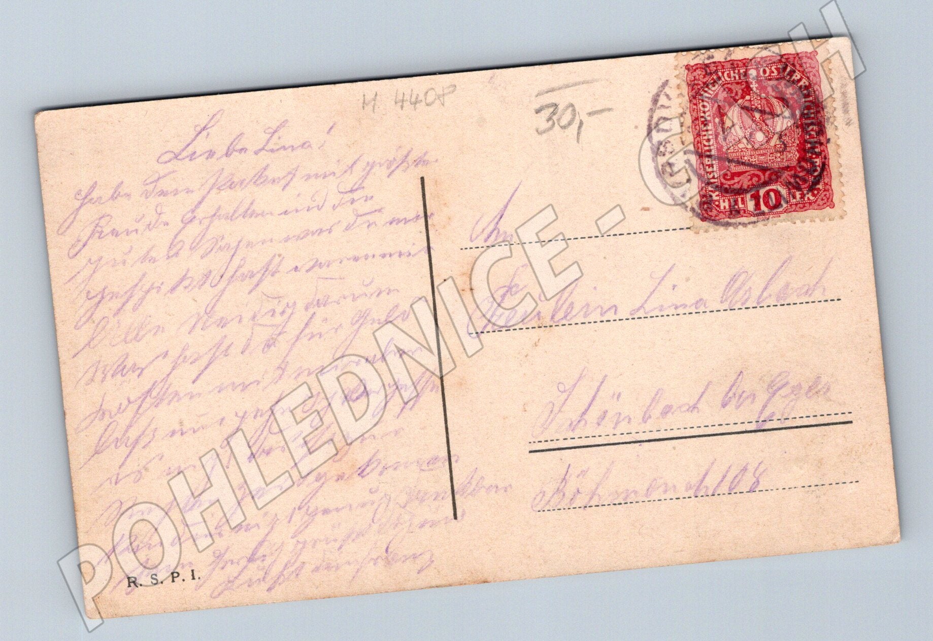 Starobylá kolorovaná pohlednice znázorňující Karlův most v Praze s věží a okolní architekturou. Na pohlednici jsou viditelné dobové postavy a typické prvky historického centra. Jedná se o malý formát do roku 1950, na zadní straně je ručně psaný text v němčině a poštovní známka Rakousko-Uherska v hodnotě 10 heller. Pohlednice je v zachovalém sběratelském stavu s patrnou patinou odpovídající věku. Výborný kousek do sbírky historických pohlednic z Prahy.