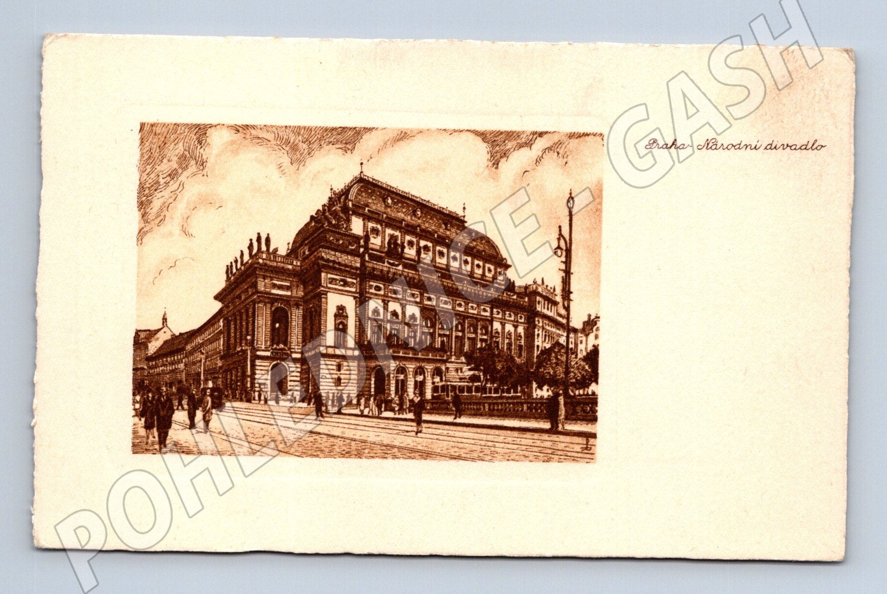 Starobylá pohlednice s vyobrazením Národního divadla v Praze. Na lícové straně je jemně zpracovaná kresba slavné budovy se zachycením dobové atmosféry i ruchu na ulici před divadlem. V pravém rohu je nápis Praha Národní divadlo . Pohlednice nebyla použitá, rubová strana je čistá, s označením Československý výrobek a výrobním číslem. Formát odpovídá klasickým pohlednicím vydávaným do roku 1950. Velmi pěkný sběratelský kus vhodný pro milovníky historických pohlednic a architektury Prahy.