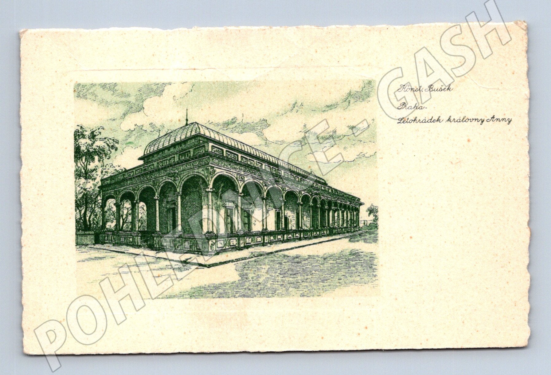 Originální stará pohlednice zobrazující historický objekt – Letohrádek královny Anny, známý také jako Belvedér v Praze. Pohlednice má krásnou grafickou podobu, na přední straně je detailní kresba letohrádku s arkádami, doplněná názvem a jménem autora Karel Bušek. Zadní strana je nepopsaná, určená ke korespondenci, s označením československého výrobce HYPA V. Pohlednice je vytištěna na kvalitním, mírně strukturovaném papíře s roztřepenými okraji a působí velmi elegantně. Výborný sběratelský kousek pro milovníky historické Prahy, architektury či sběratele pohlednic s motivy hradů a zámků.