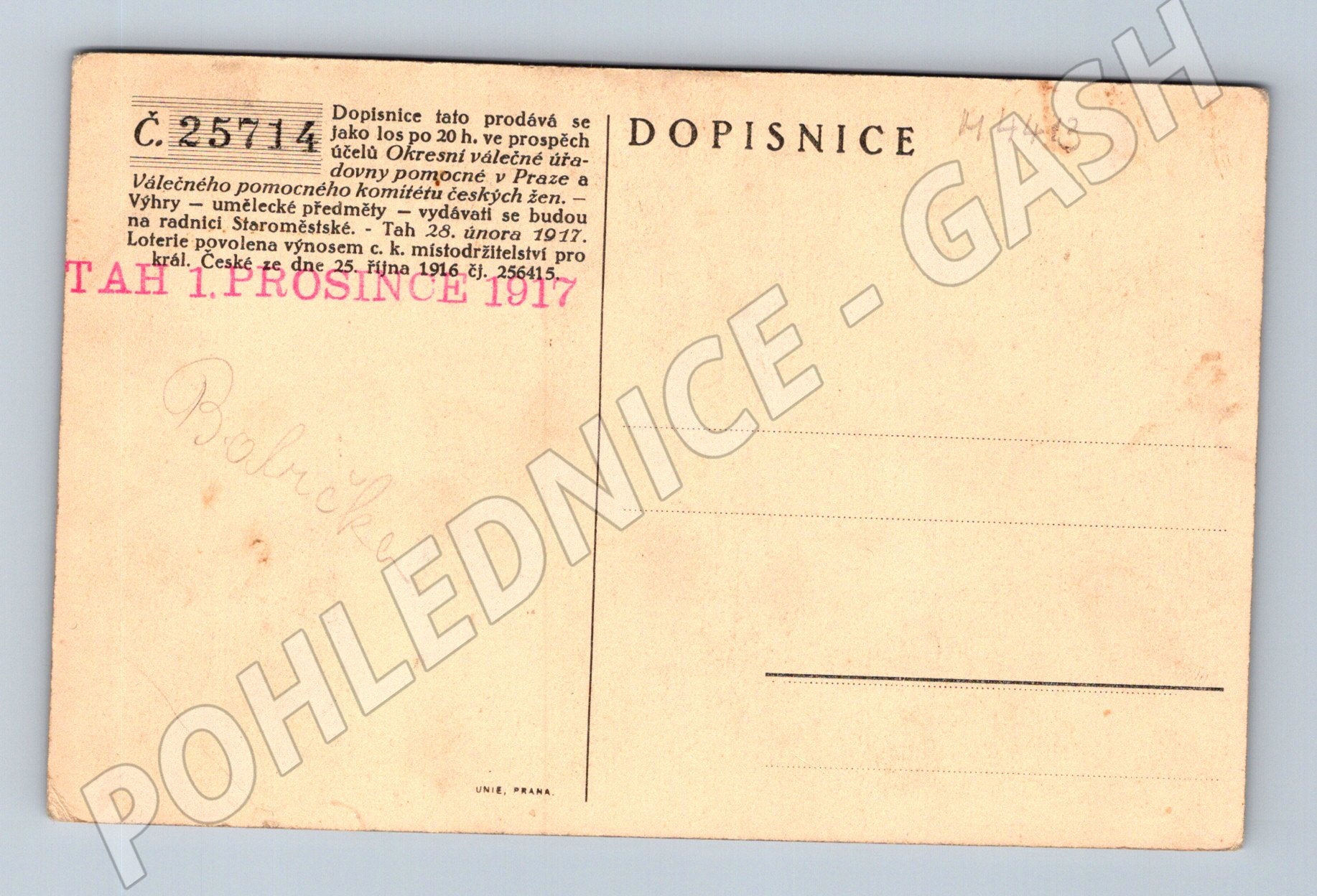 Historická pohlednice z roku 1917 s vyobrazením panoramatu Prahy, pohledem na Pražský hrad a okolí. Jedná se o pohlednici vydanou Unie, Praha, s unikátním číslem a popisem na zadní straně, kde je uvedeno, že sloužila k prospěšné účelům Válečného pomocného komitétu českých žen. Na zadní straně je také vyznačena loterijní akce datovaná 1. prosince 1917. Pohlednice je ve velmi dobrém stavu, na přední straně tisková reprodukce kresby, na zadní straně předtištěné řádky pro adresu. Vhodné pro sběratele historických pohlednic či zájemce o českou historii a Prahu.