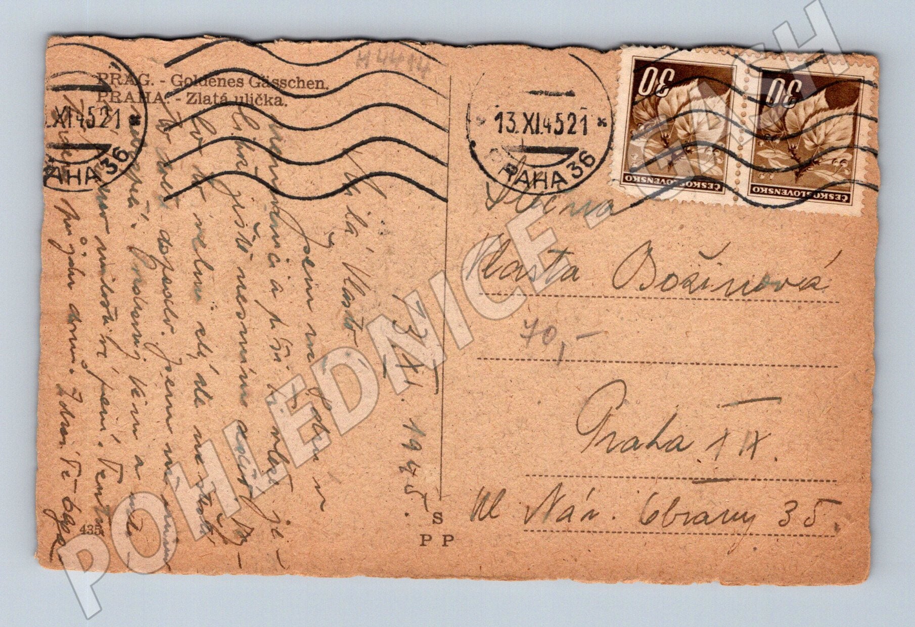 Zlatá ulička Praha – pohlednice 1945, malý formát, známky