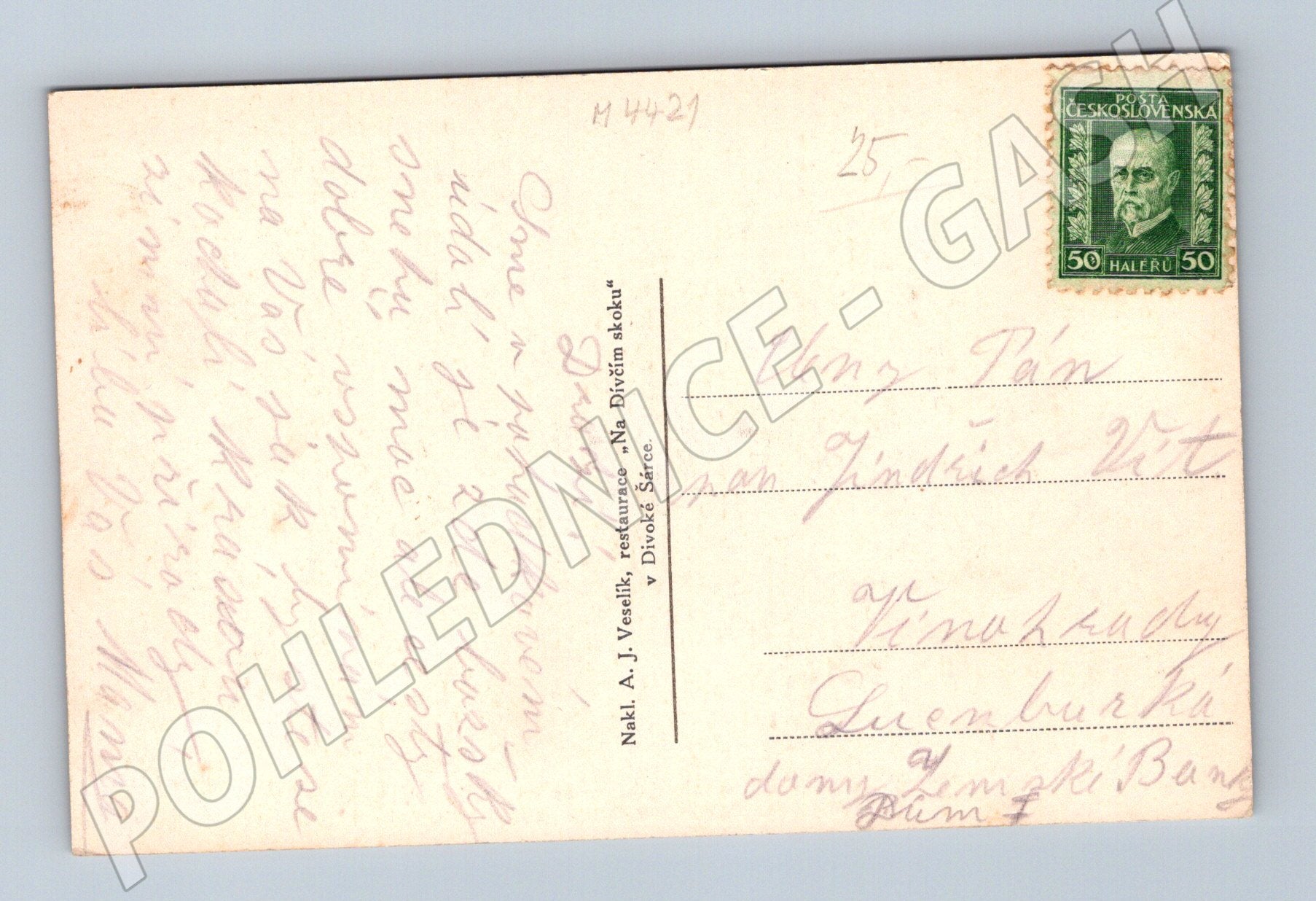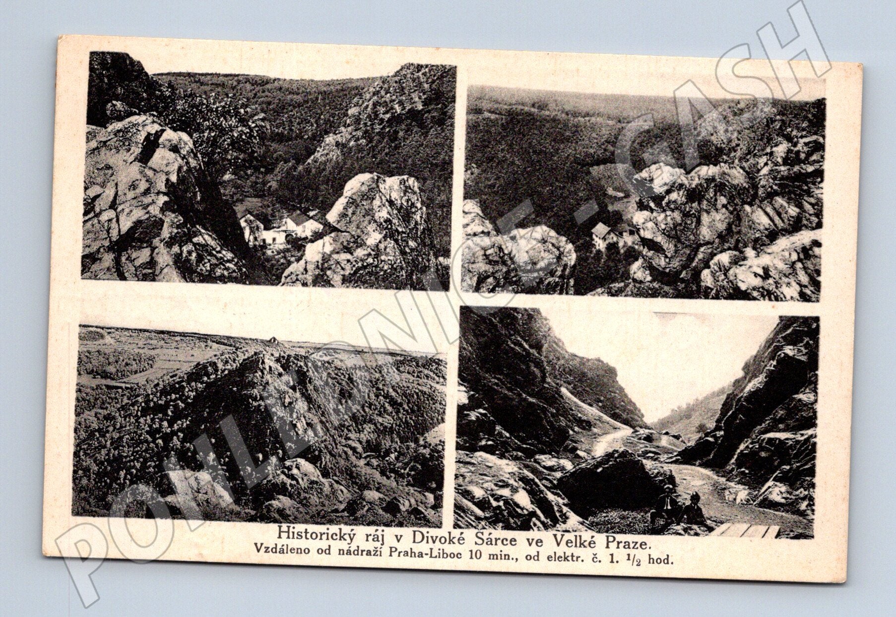 Originální historická pohlednice z období první republiky s motivem Historický ráj v Divoké Šárce ve Velké Praze . Pohlednice zobrazuje několik černobílých snímků známé přírodní památky na okraji Prahy. Na zadní straně je původní rukopisná korespondence, adresa a dobová známka s portrétem T. G. Masaryka v hodnotě 50 haléřů. Vydavatel: Nakl. A. J. Veselík, restaurace „Na Dívčím skoku . Výborný sběratelský stav, patina i známky stáří, drobné opotřebení dle fotografií, známka nepoškozena. Skvělý doplněk do sbírky i jako dárek!