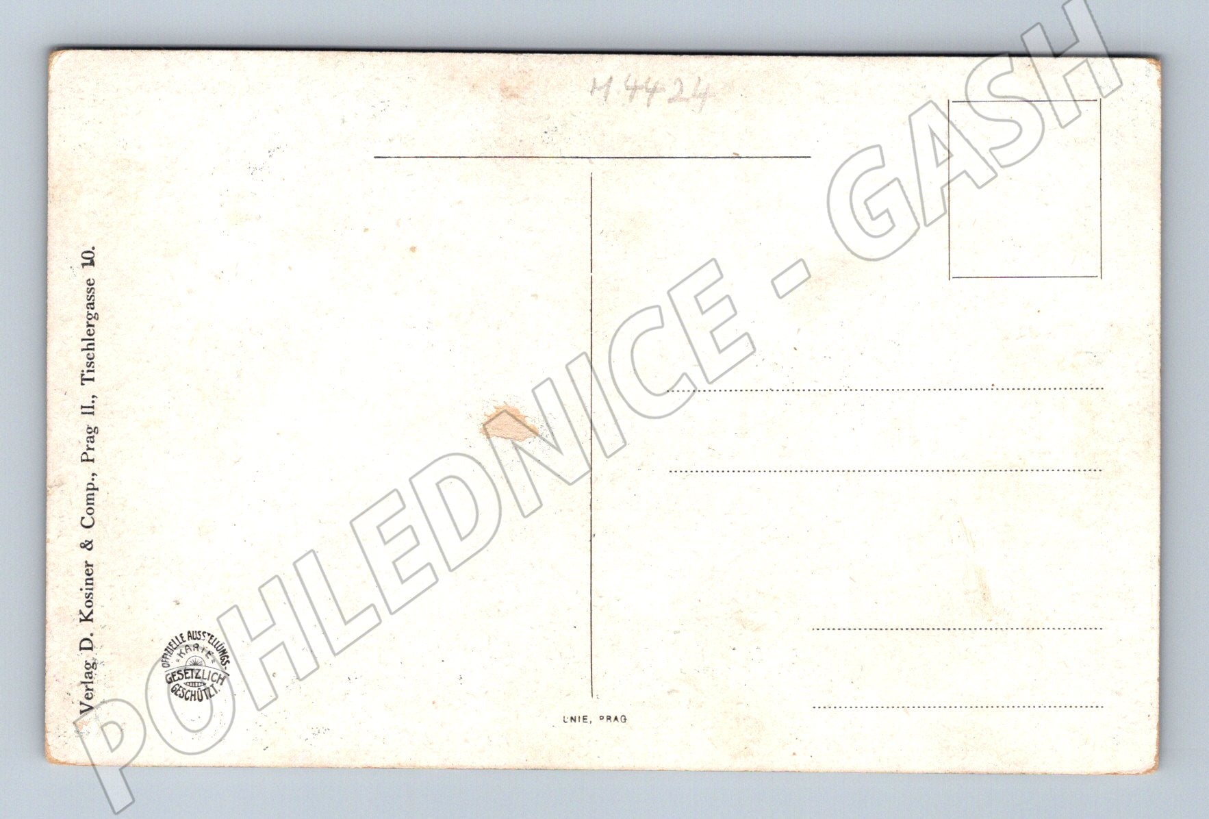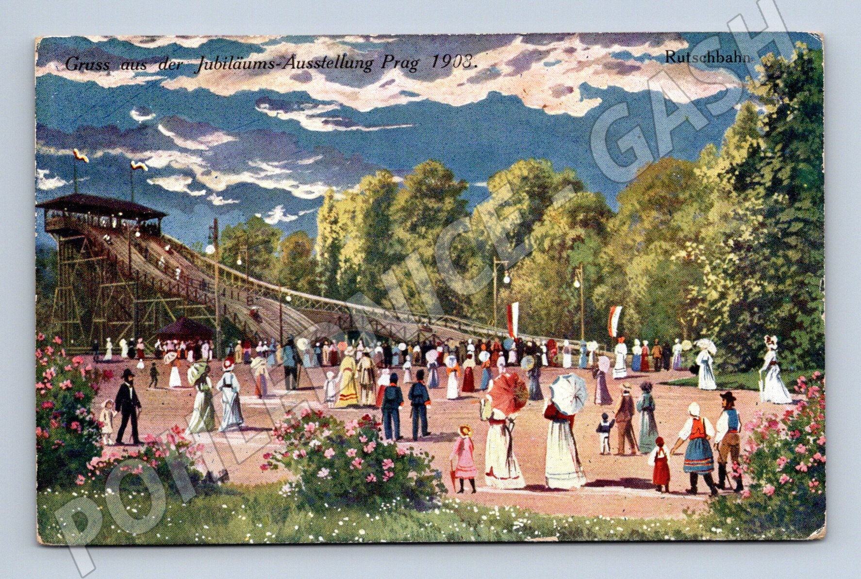Originální stará pohlednice z Jubilejní výstavy v Praze roku 1908. Na přední straně je umělecké vyobrazení dobové atrakce zvané Rutschbahn – historická skluzavka, kolem které se prochází elegantně oblečení návštěvníci v typické módě počátku 20. století. Nahoře nápis Gruss aus der Jubiläums-Ausstellung Prag 1908 . Pohlednice má krásně zachovanou barevnou ilustraci, rubová strana s místem pro známku a adresu, vydavatel D. Kosiner & Comp., Praga. Nádherný sběratelský kousek s motivem významné pražské události! Stav viz foto.