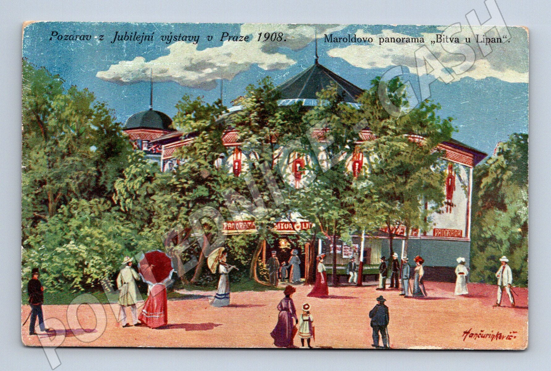 Originální historická pohlednice ze série vydané k Jubilejní výstavě v Praze v roce 1898. Na přední straně je zachycena Maroldova panorama Bitva u Lipan – slavná monumentální kruhová malba zobrazující bitvu u Lipan, která vznikla při příležitosti této významné pražské výstavy. Typická barevná ilustrace s návštěvníky v dobových šatech. Pohlednice nebyla použita a je ve velmi dobrém stavu s drobnými stopami po střihu. Vydavatel: D. Kosiner a spol., Praha. Razítko Zákonem chráněno . Velmi zajímavý kousek pro sběratele, milovníky české historie a Prahy.