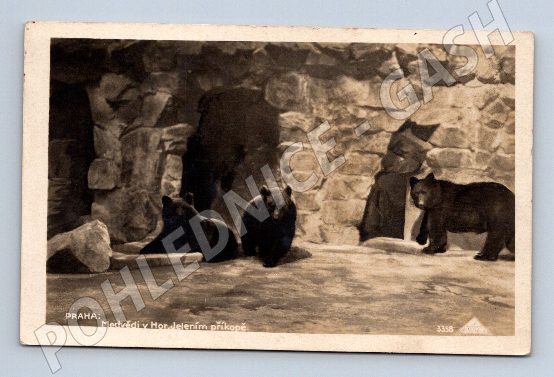 Starobylá pohlednice znázorňující medvědy v Horním Jelením příkopě v Praze. Pohlednice je černobílá, s označením místa PRAHA: Medvědi v Hor. Jelením příkopě a číslem 3358. Na zadní straně je pohlednice popsána ručně psaným textem a adresována na konkrétní osobu. Jedná se o zajímavý sběratelský kus s krásnou zvířecí tematikou a historickým nádechem. Pohlednice nese stopy stáří, patinu a je vhodná pro milovníky Prahy, historie či sběratele starých pohlednic se zvířaty.