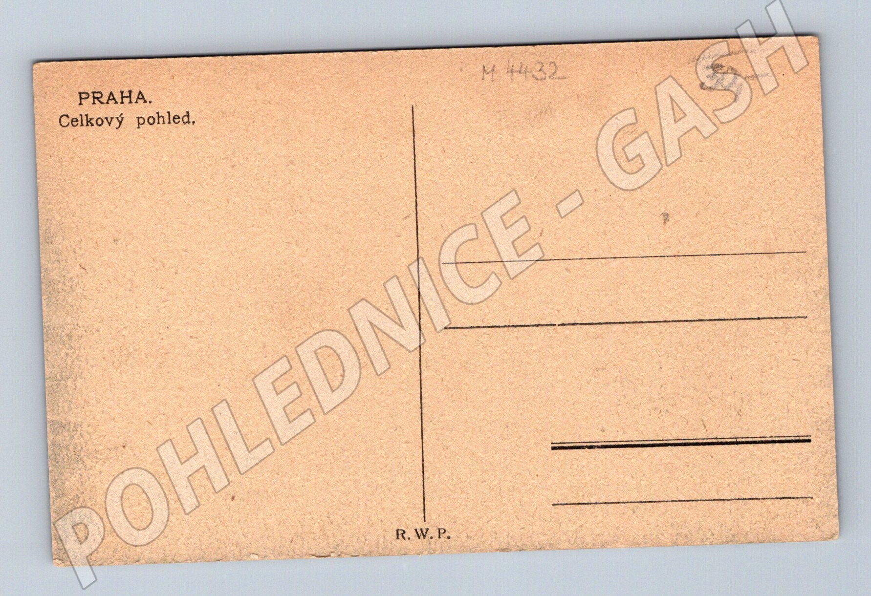 Originální stará pohlednice s celkovým pohledem na Prahu. Na obrázku dominuje panoramatický výhled na historické centrum města, Karlův most, Vltavu i okolní starou zástavbu. Pohlednice je v klasickém menším formátu a pochází z období do roku 1950. Zadní strana je čistá, bez popisu a známek použití. Na zadní straně je označení PRAHA. Celkový pohled. a údaje vydavatele R.W.P. Výborný sběratelský stav vzhledem ke stáří, pouze drobné známky času. Skvělý přírůstek pro sběratele historických pohlednic Prahy!