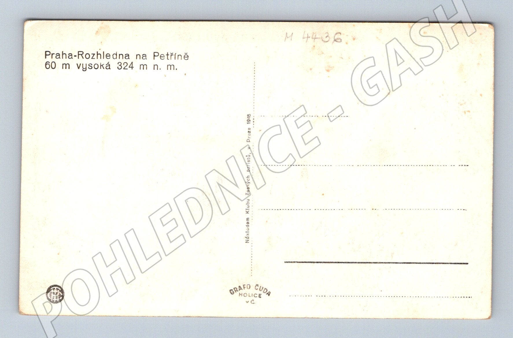 Originální stará pohlednice zobrazující slavnou rozhlednu na Petříně v Praze. Na přední straně je černobílá fotografie samotné věže, okolní přírody a částí města pod rozhlednou. Zadní strana je rozdělena pro adresu a zprávu, s informací: Praha - Rozhledna na Petříně, 60 m vysoká, 324 m n. m. Vydavatel: Klub českých turistů, Praha (Grafo Čuda, Holice v Čechách). Pohlednice je v dobrém sběratelském stavu, odpovídá období první poloviny 20. století, neprošlá poštou. Skvělý doplněk sbírky historických pohlednic Prahy či českých památek.