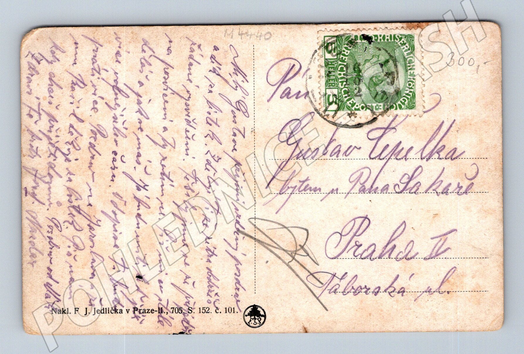 Historická pohlednice s tematikou převozu koruny svato-václavské z Vídně do Prahy 9. srpna 1791. Na přední straně je barevná kresba zachycující slavnostní průvod s jezdeckým doprovodem před historickými budovami. Pohlednice byla odeslána, včetně známky a ručně psaného textu na zadní straně. Vydavatel: F. J. Jedlička, Praha II. Stav odpovídá stáří, rohy jsou lehce ošoupané, drobné stopy po manipulaci. Cenná sběratelská ukázka poštovní historie a českých dějin.