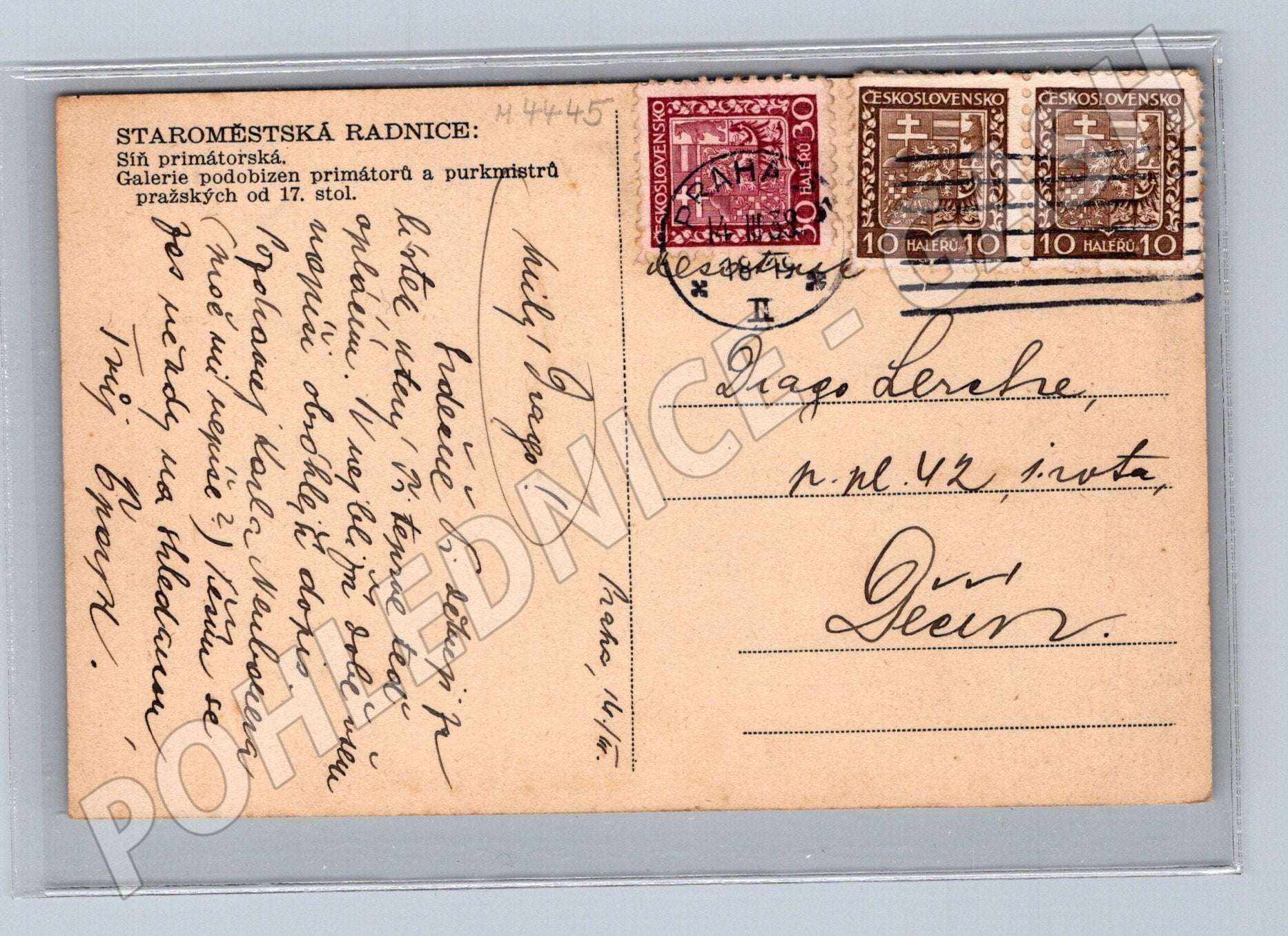 Nabízím originální historickou pohlednici se zobrazením Primátorské síně Staroměstské radnice v Praze. Pohlednice pochází z období první poloviny 20. století. Na přední straně je černobílá fotografie galerie s podobiznami pražských primátorů a purkmistrů, bohatě zdobený interiér s lustry a obrazy. Na zadní straně jsou zachovalé známky (Československo, 10 a 30 haléřů), ručně psaný text a poštovní razítko Praha. Výborný stav s mírným opotřebením odpovídajícím stáří. Skvělý sběratelský kousek z historické Prahy!