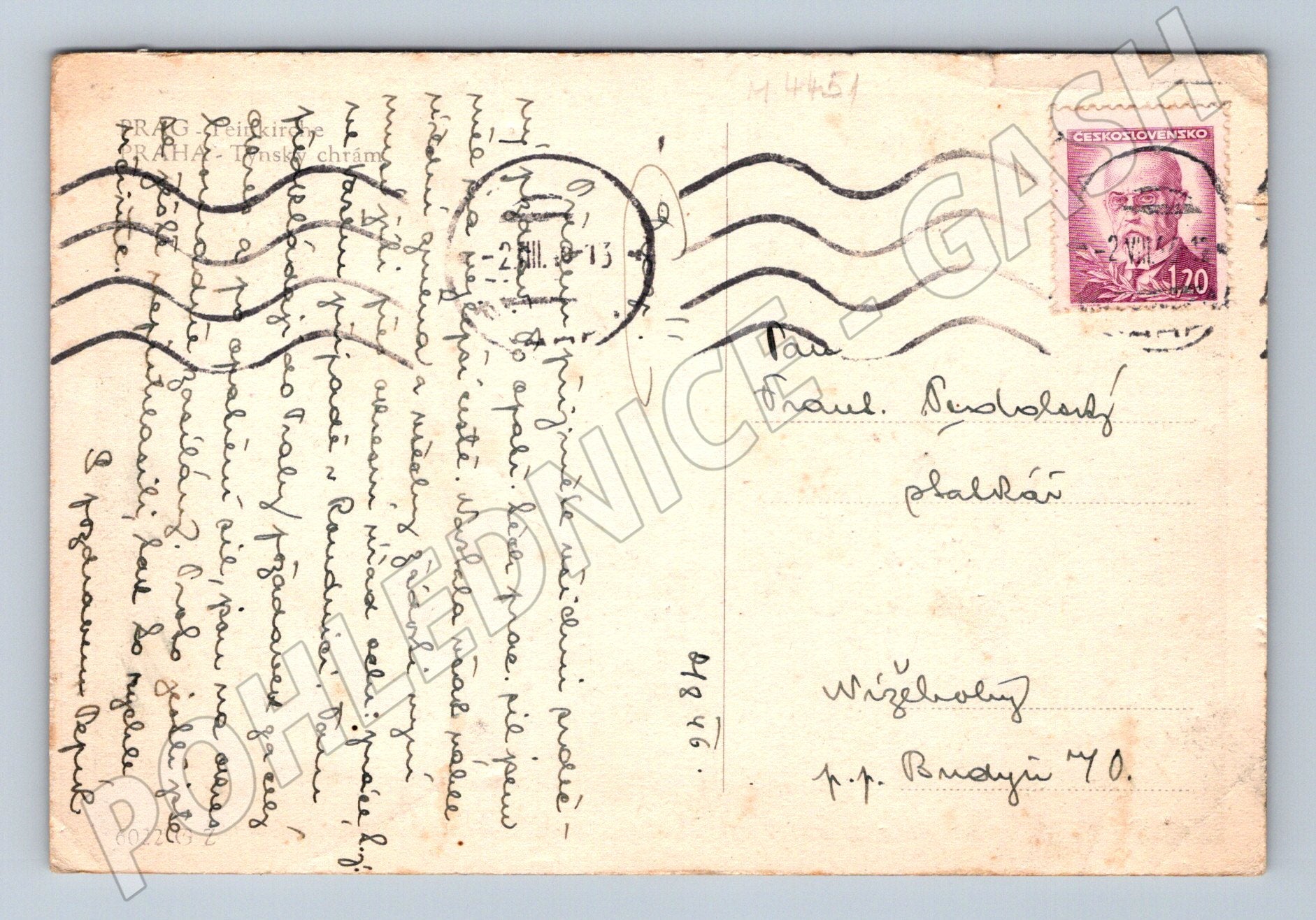 Starobylá černobílá pohlednice zachycující Staroměstské náměstí v Praze s detailním pohledem na Orloj a v pozadí s Týnským chrámem. Jedná se o historickou korespondenční pohlednici s ručně psaným vzkazem a poštovní známkou z období Československa (hodnota 1,70 Kčs, portrét T. G. Masaryka). Pohlednice je odeslaná, nese známky stáří a opotřebení na rozích. Vhodné do sbírky milovníků historické Prahy nebo sběratelů pohlednic z období první poloviny 20. století.