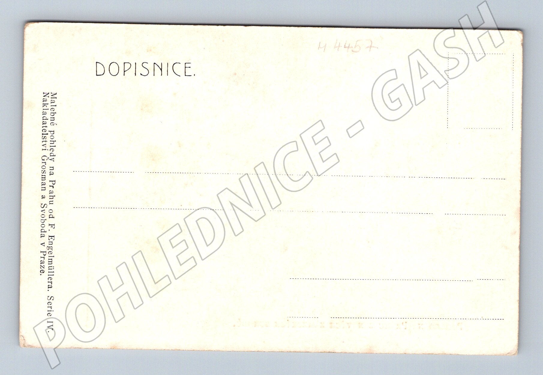 Originální stará pohlednice s malovaným pohledem na Prahu z nových zámeckých schodů. Pohlednicová ilustrace zachycuje malebné pražské střechy a dominantu města s výraznou zelenou kopulí kostela. Na přední straně je uveden nápis: Pohled na Prahu z nových zámeckých schodů. Vydavatel: Grosman a Svoboda v Praze, série IV, podle obrazu F. Engelmüllera. Formát tradiční malý, typ Dopisnice . Pohlednice je čistá, nebyla odeslána a je ve velmi dobrém sběratelském stavu. Vhodná pro sběratele historických pohlednic z Prahy či starého Československa.