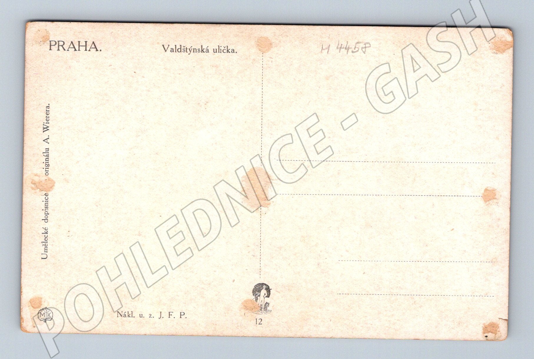 Umělecká pohlednice zobrazující Valdštejnskou uličku v Praze. Pohlednice je reprodukcí originálu malíře A. Wiegera. Na přední straně je malebně zachycena pražská architektura a každodenní ruch v historické části města. Zadní strana je nevyplněná, nese označení Umělecké dopisnice - originálu A. Wiegera a vydavatele J.F.P. Pohlednice pochází z období první poloviny 20. století, malý formát, patrné jsou mírné známky stáří v rozích (viz foto). Krásný sběratelský kousek pro milovníky staré Prahy a výtvarných pohlednic.
