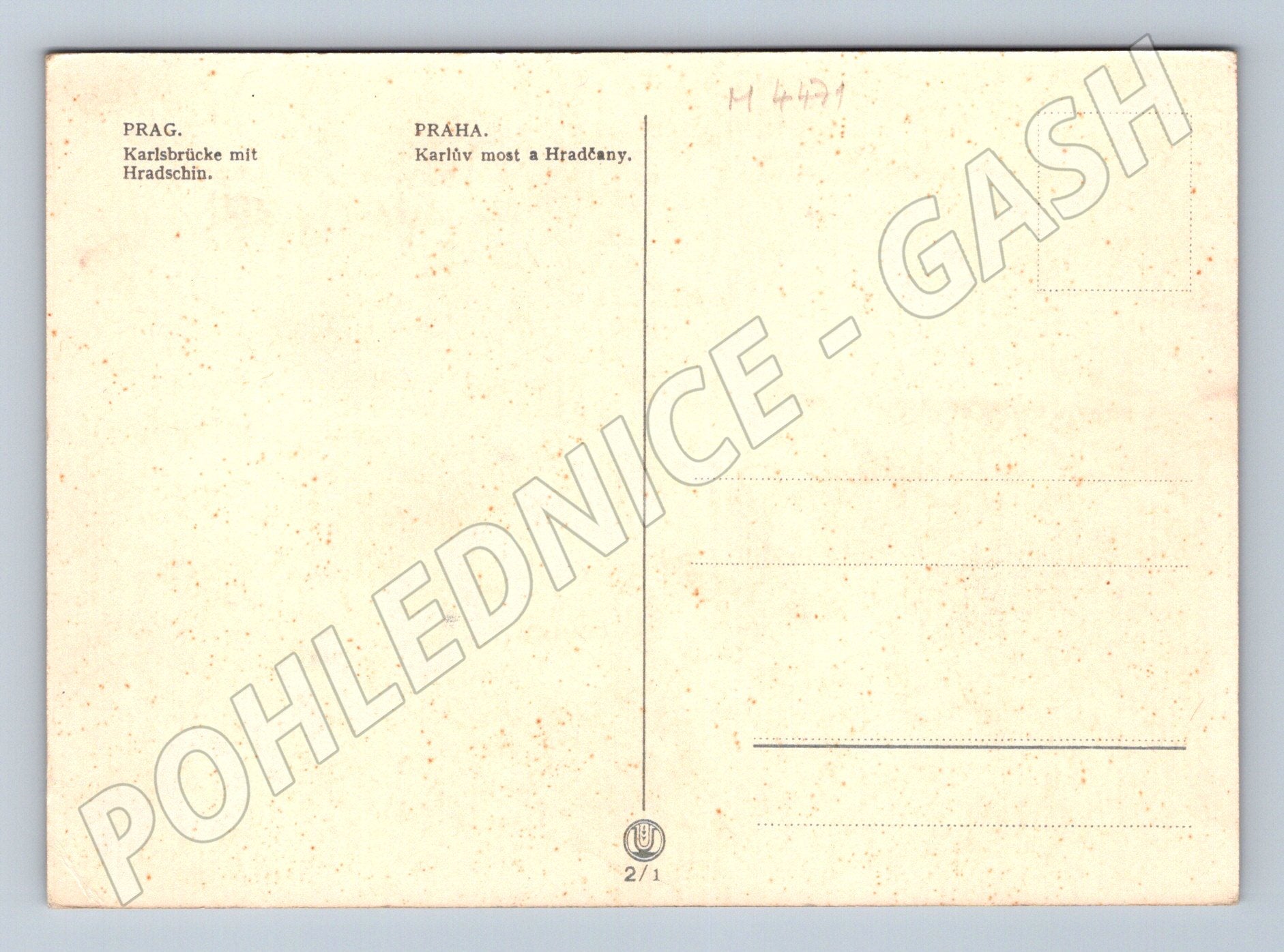 Originální pohlednice s malovaným motivem Karlova mostu a Hradčan v Praze. Pohlednice je v menším formátu a pochází z období před rokem 1950. V popředí je zachycen Karlův most přes řeku Vltavu, v pozadí panorama Pražského hradu a katedrály sv. Víta. Zadní strana pohlednice je rozdělena pro adresu a text, bez známky a poštovního razítka. Vhodné pro sběratele historických pohlednic a pražských památek. Stav odpovídá stáří, místy hnědé tečky (patina, viz foto).