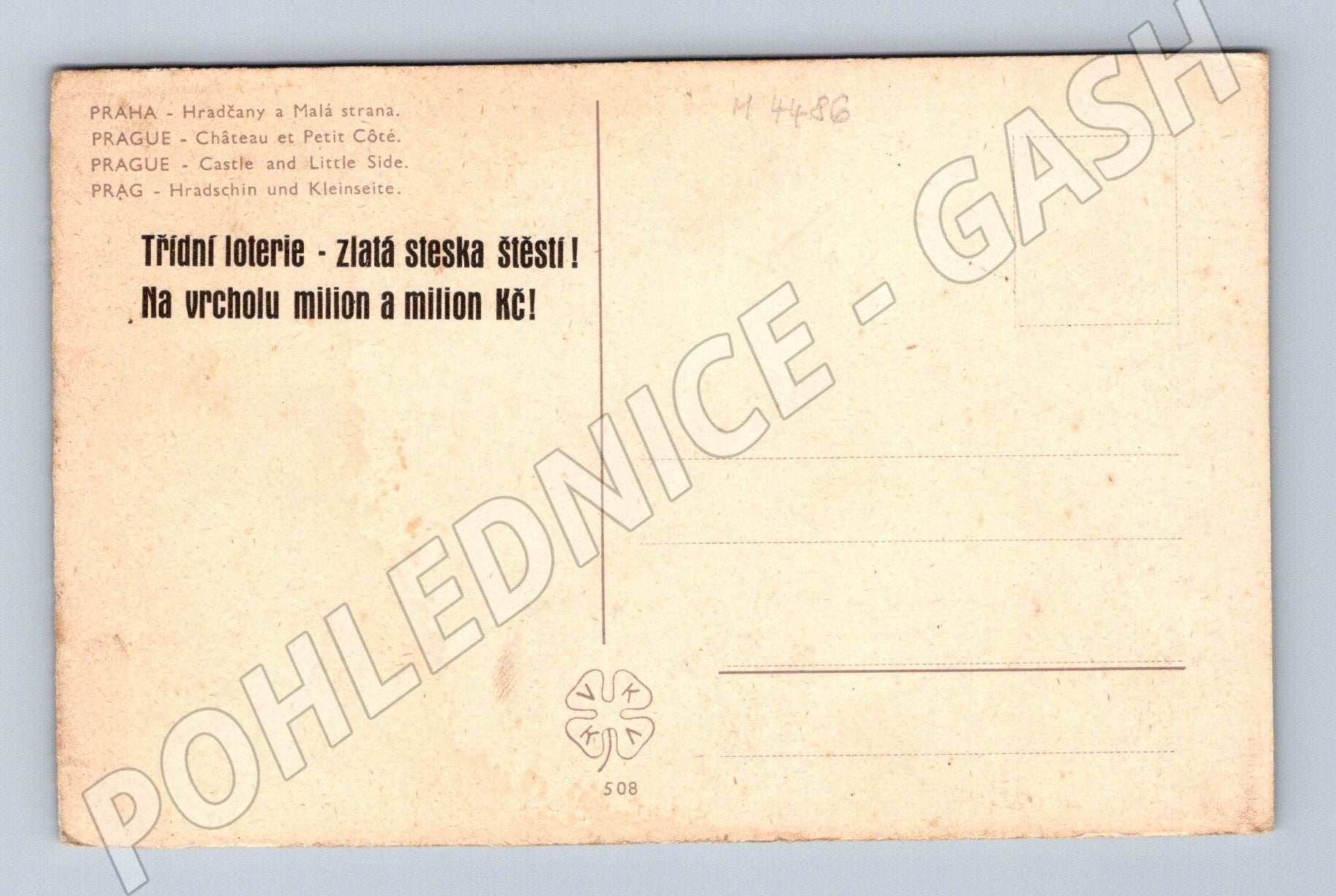 Starobylá pohlednice zobrazující ikonický pohled na Pražský hrad a Malou Stranu v Praze. Pohlednice je černobílá, ve velmi dobrém stavu, bez výrazných poškození. Na zadní straně jsou popisky v češtině, francouzštině, angličtině a němčině: PRAHA - Hradčany a Malá strana. PRAGUE - Château et Petit Côté. PRAGUE - Castle and Little Side. PRAG - Hradschin und Kleinseite. Dále obsahuje reklamní text na třídní loterii: Třídní loterie - Zlatá stezka štěstí! Na vrcholu milion a milion Kč! Vydavatelské informace jsou naznačeny symbolickým znakem a číslem 508. Krásná historická sběratelská pohlednice z období první poloviny 20. století, vhodná jak pro sběratele, tak jako originální dárek.